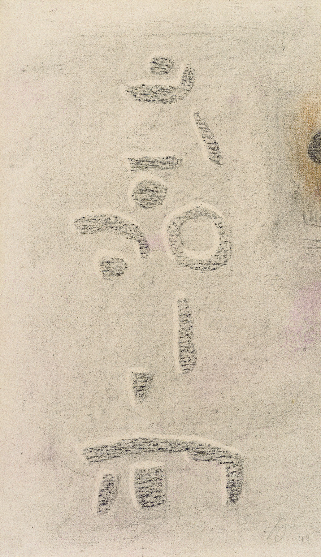 Kohle, gewischt, radiert, Ölkreide in Schwarz, durchgerieben, Rotbraun, fixiert, auf rosafarbigem Ingres-Bütten mit Wz. l. u.: Hahn im Kreis