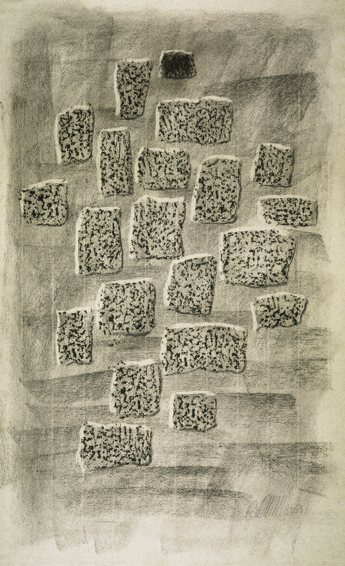 Kohle, gewischt, radiert, Ölkreide in Schwarz, durchgerieben, fixiert, auf hellgrünem Ingres-Bütten