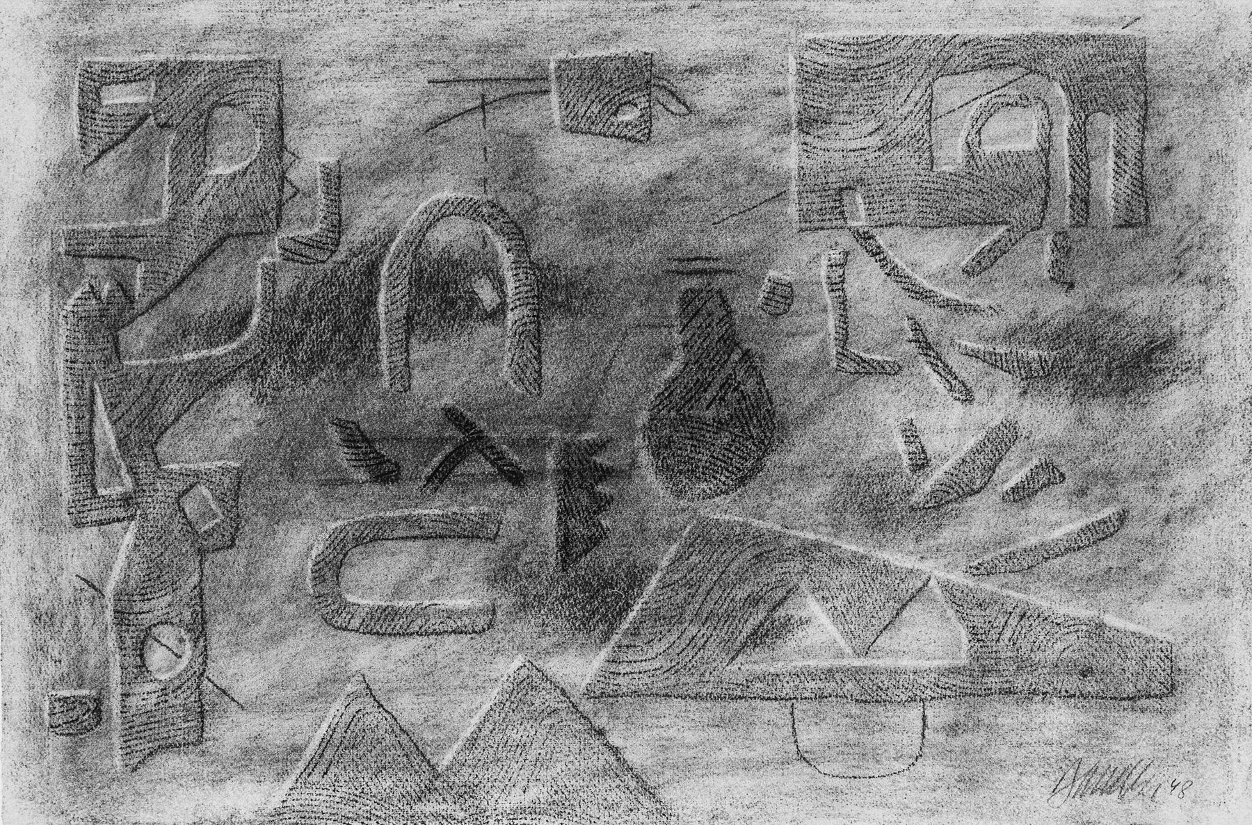 Kohle, gewischt, radiert, Ölkreide in Schwarz, durchgerieben, fixiert, auf maisgelbem Ingres-Bütten mit Wz. I. u.: INGRES und r. o.: CANSON & MO...