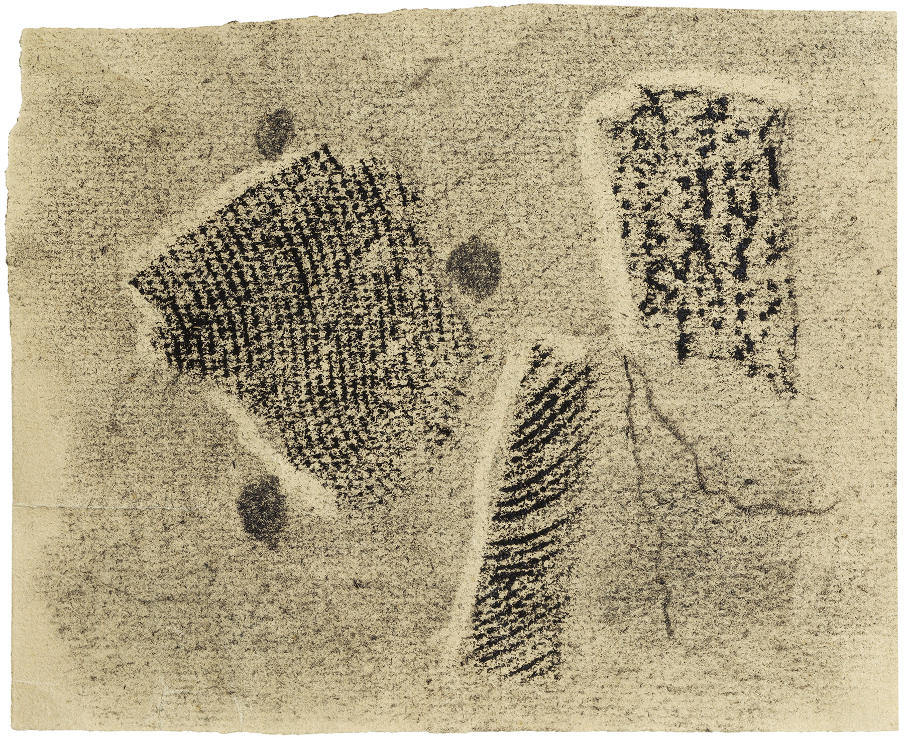 Kohle, gewischt, radiert, Ölkreide in Schwarz, durchgerieben, fixiert, auf chamoisfarbigem, am Rand o., l. und u. leicht unregelmäßig beschnittenem, zur Ecke l. o. hin gerissenem Ingres-Bütten