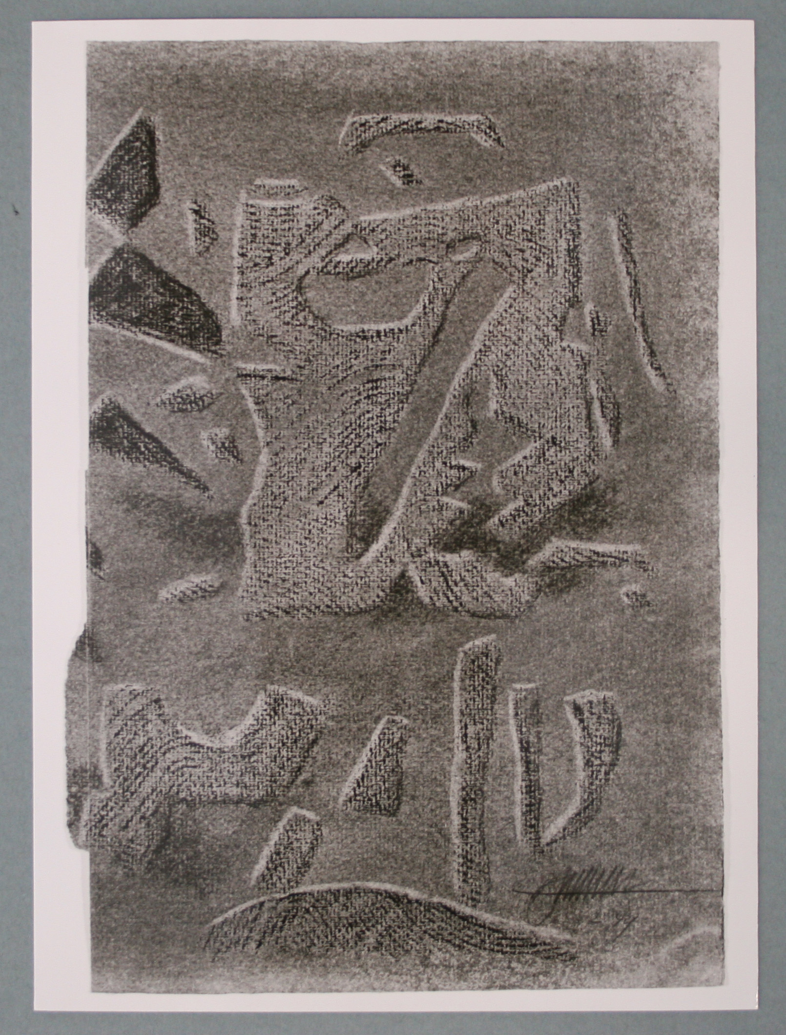 Kohle, gewischt, radiert, Ölkreide in Schwarz, durchgeneben, fixiert, auf graugrünem, am Rand l. im scharfen Knick unregelmäßig abgetrenntem Ingres-Bütten mit Wz. r. u.: PMF (ITALIA)