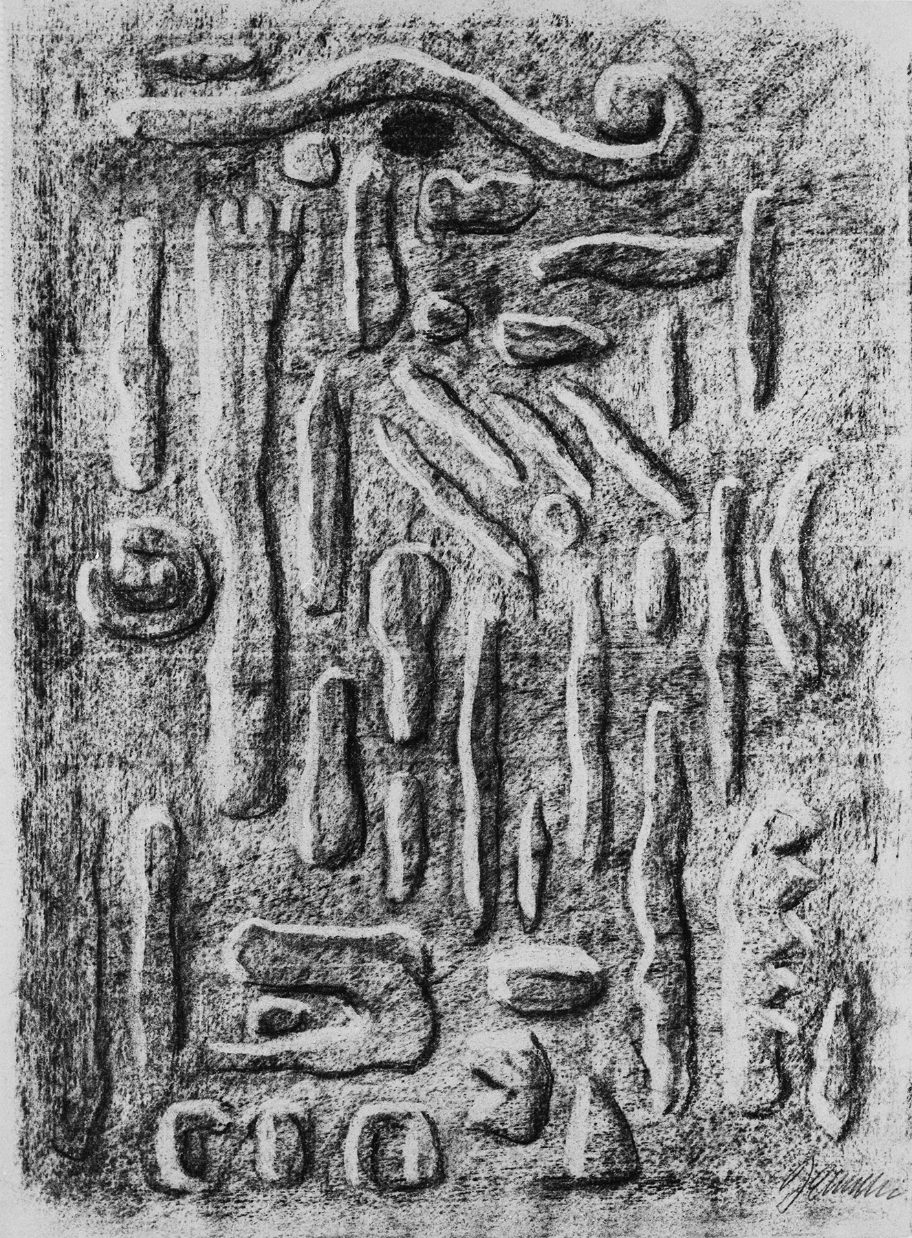 Vgl. die 1952 datierte Z 2158. 2156-2163: Reliefkompositionen aus den Jahren 1952 und 1953 in Wisch-, Radier- und Durchreibetechnik.