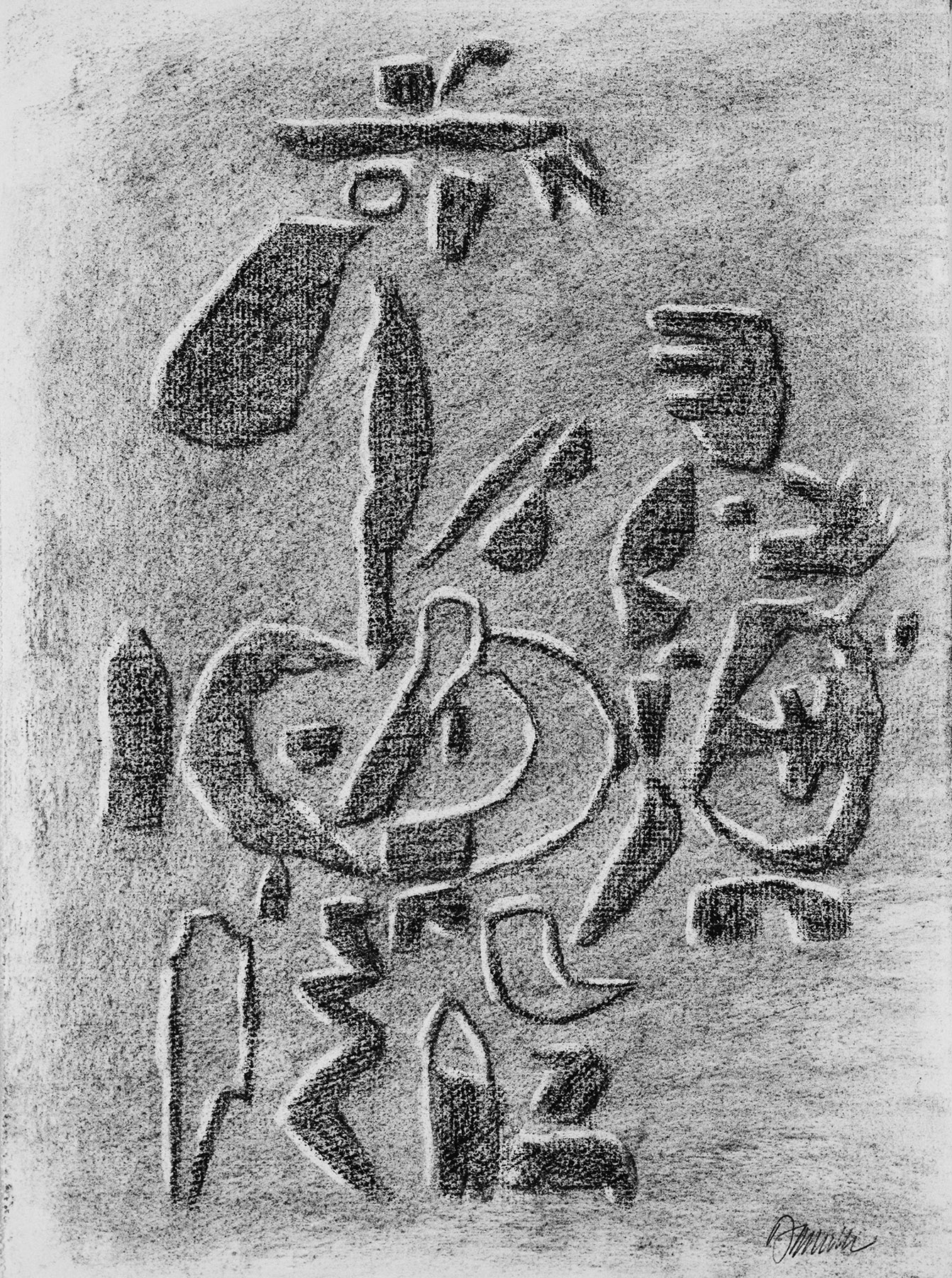 Kohle, gewischt, radiert, Ölkreide in Schwarz, fixiert, auf chamoisfarbigem, am Rand l. perforiertem Ingres-Bütten