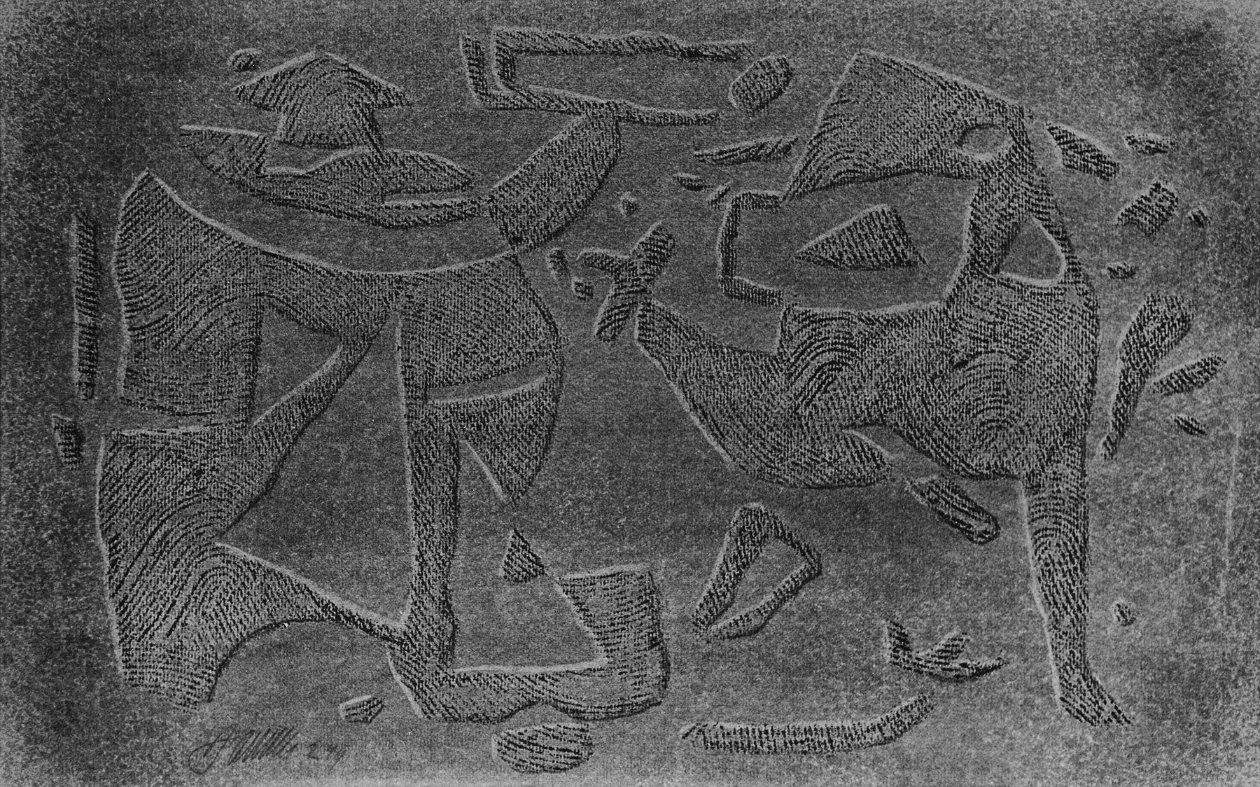 Kohle, gewischt, radiert, Ölkreide in Schwarz, durchgerieben, fixiert, auf braunem Ingres-Bütten mit Wz.: PMF (ITALIA)