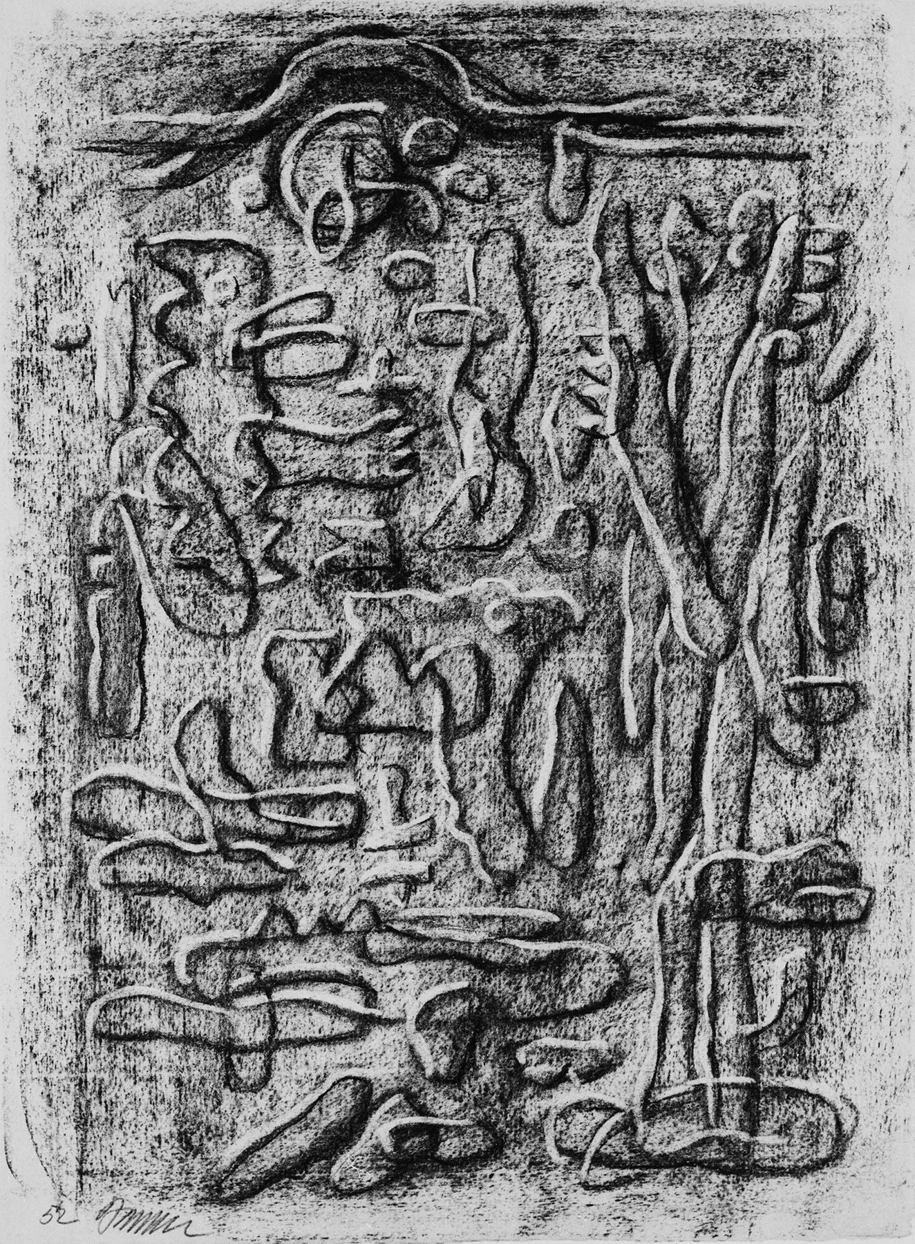 Kohle, gewischt, radiert, fixiert, auf chamoisfarbigem, am Rand l. perforiertem Ingres-Bütten