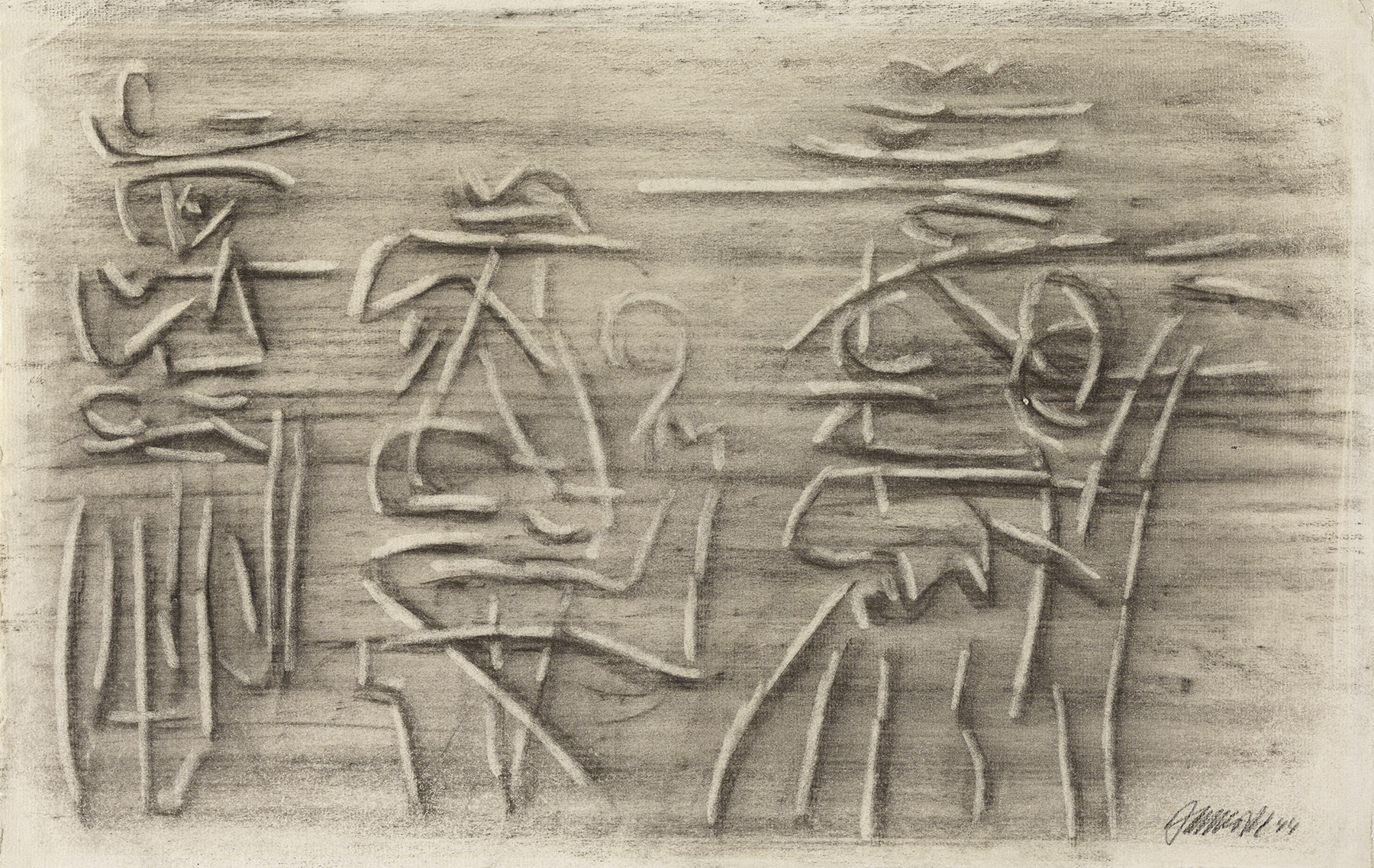 Kohle, gewischt, radiert, fixiert, auf chamoisfarbigem Ingres-Bütten