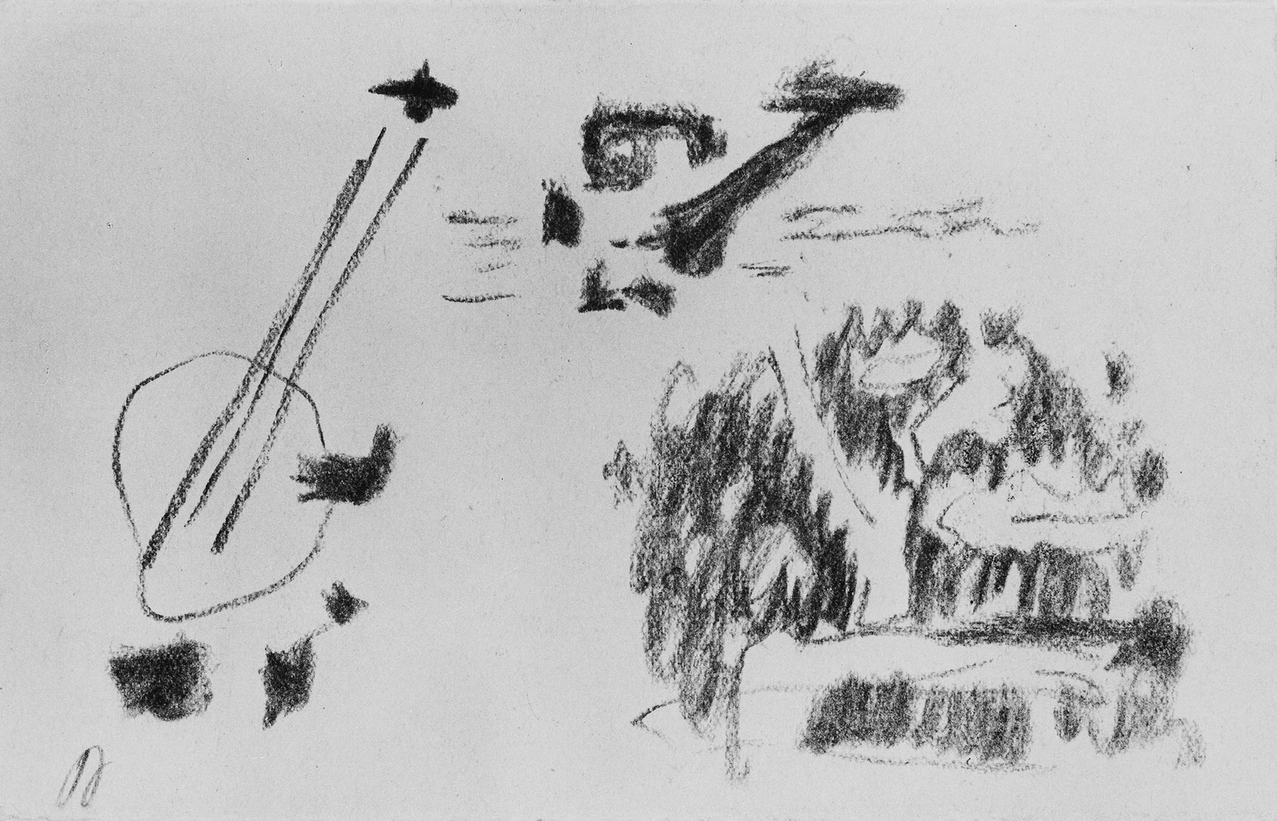 Kohle, auf chamoisfarbigem, an den Rändern gerissenem Kupferdruckkarton
