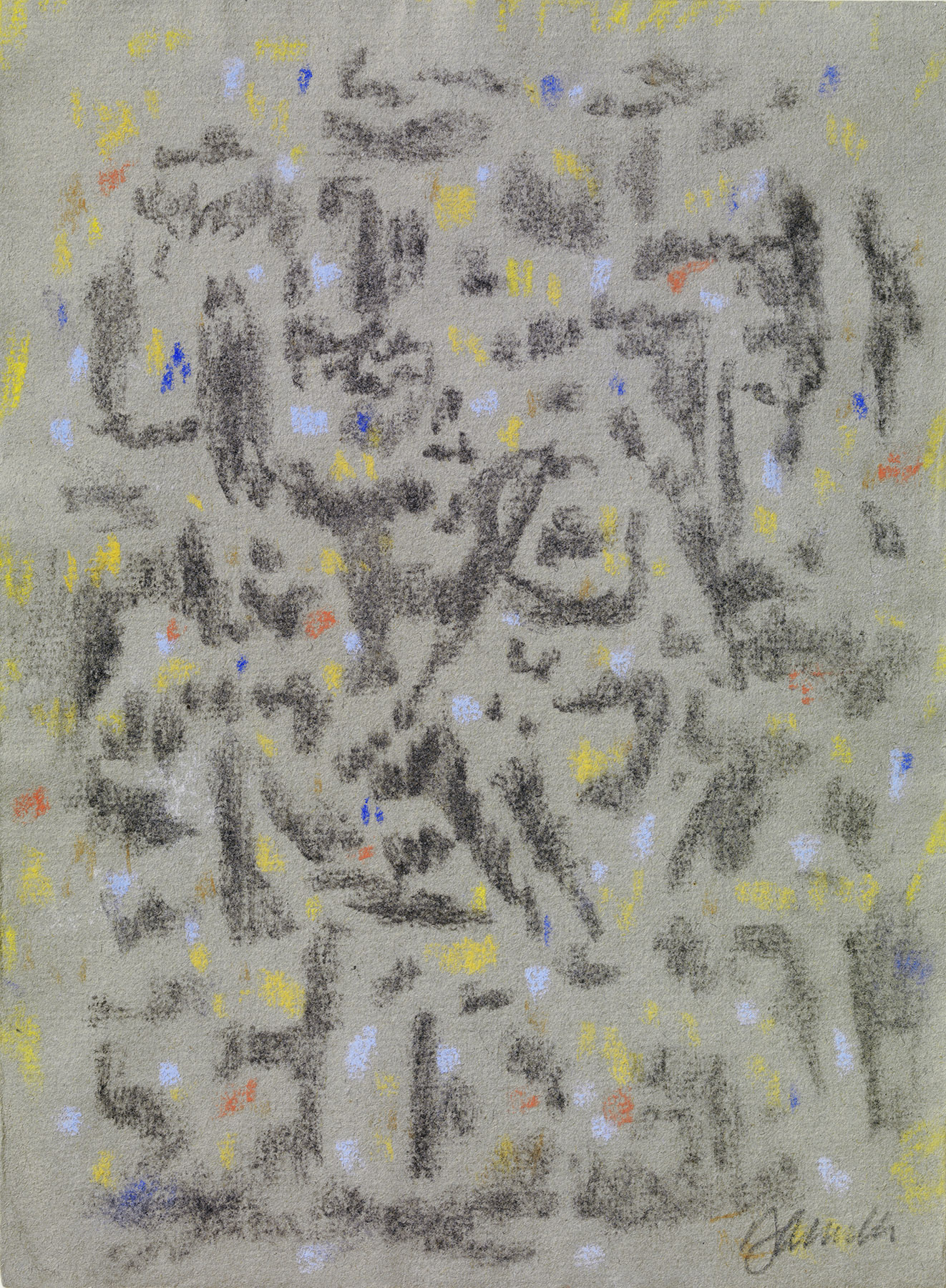 Kohle, Pastellkreide in Hellblau, Blau, Ockergelb, Zitronengelb, Rot, Braun, auf grauem Bütten