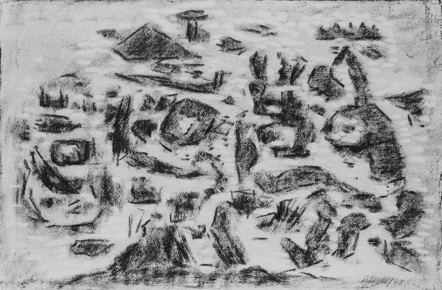 Kohle, gewischt, radiert, fixiert, auf lindgrünem Ingres-Bütten