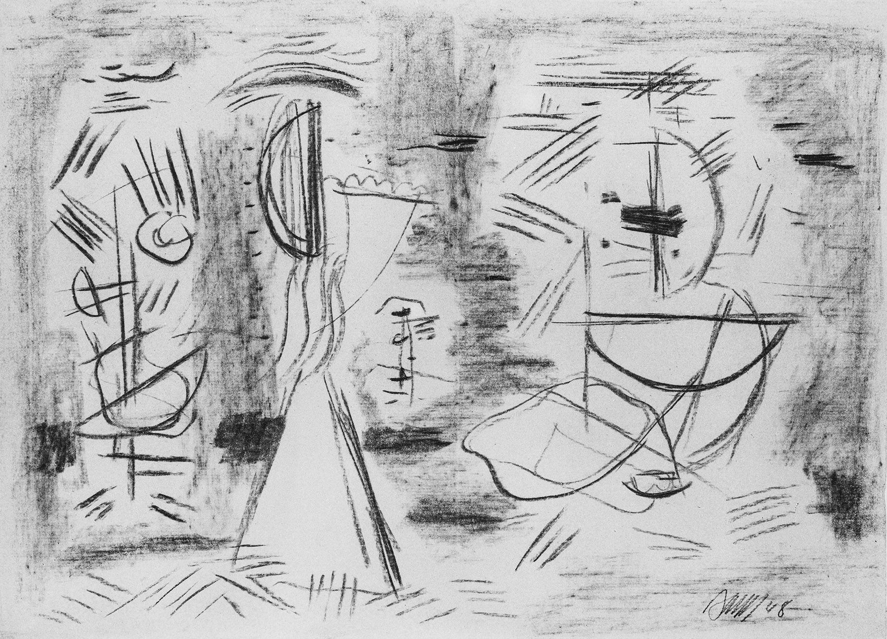 Kohle, z. T. gewischt, fixiert, auf chamoisfarbigem Maschinen-Bütten
