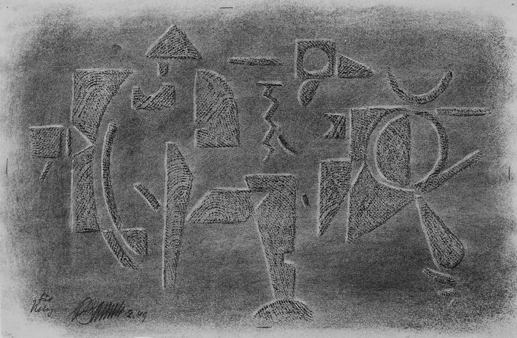 Kohle, gewischt, radiert, Ölkreide in Schwarz, durchgerieben, fixiert, auf beigefarbigem Ingres-Bütten
