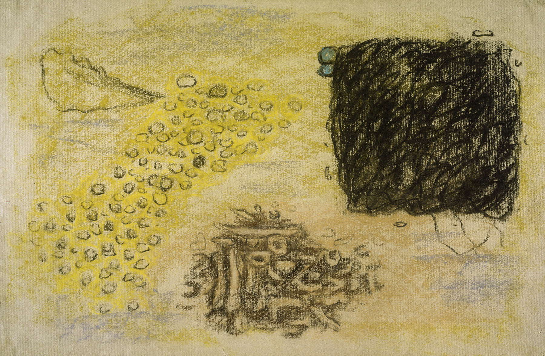 Kohle, Pastell in Gelb, Grau, Braun, Türkis, fixiert, auf beigefarbigem Ingres-Bütten mit Wz. r. u.: PMF (ITALIA)