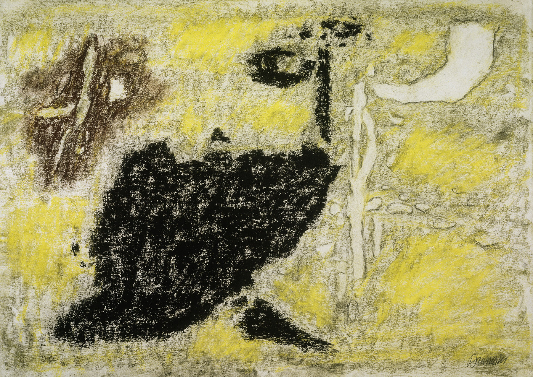 Kohle, z. T. gewischt, radiert, Pastell in Schwarz, Gelb, Braun, z. T. naß aufgetragen, fixiert, auf chamoisfarbigem, dünnem, am Rand o. im scharfen Knick, l. leicht unregelmäßig abgetrenntem Zeichenkarton
