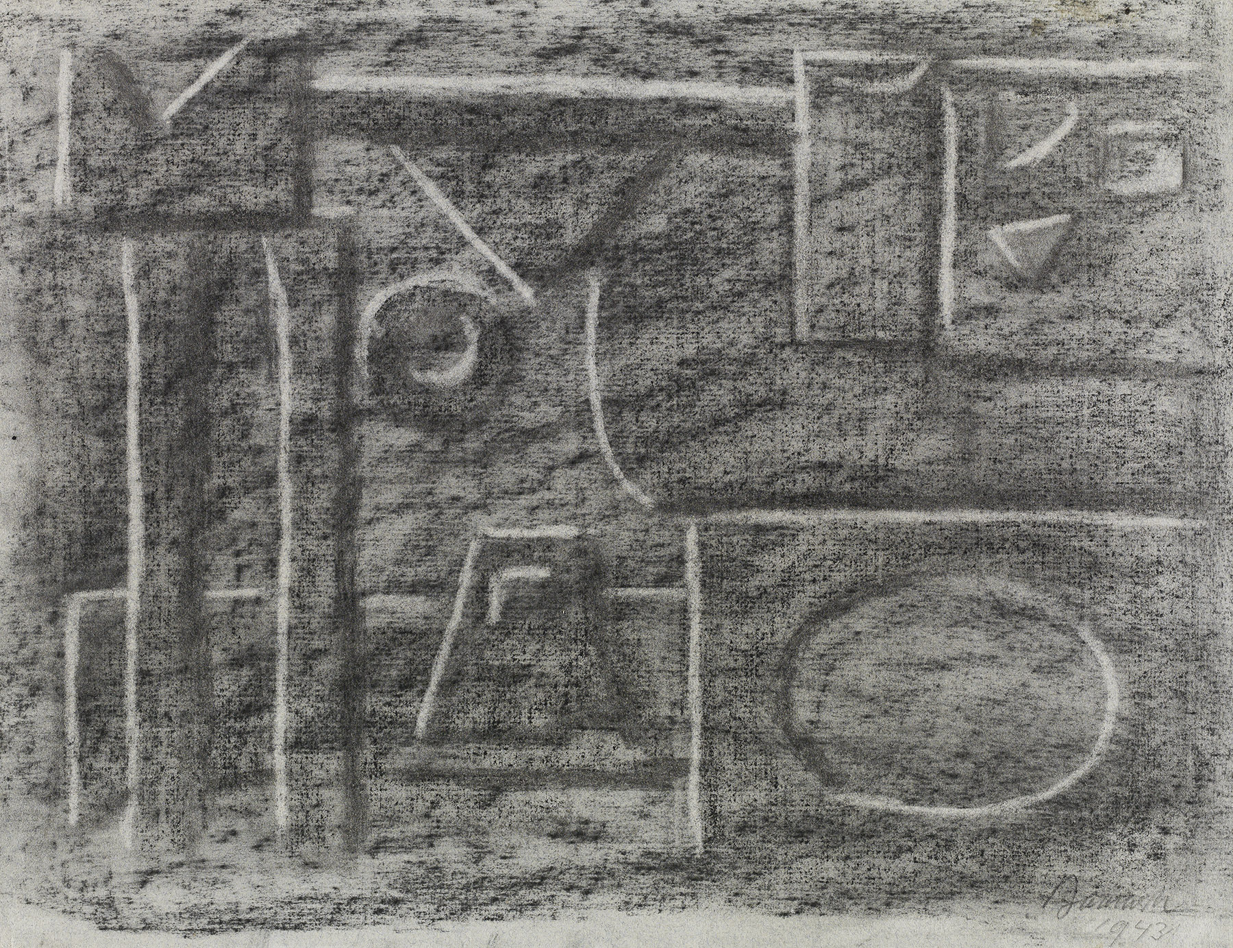 Kohle, gewischt, radiert, Ölkreide in Schwarz, fixiert, auf lichtblauem Ingres-Bütten mit Wz. l. u.: Hahn im Kreis