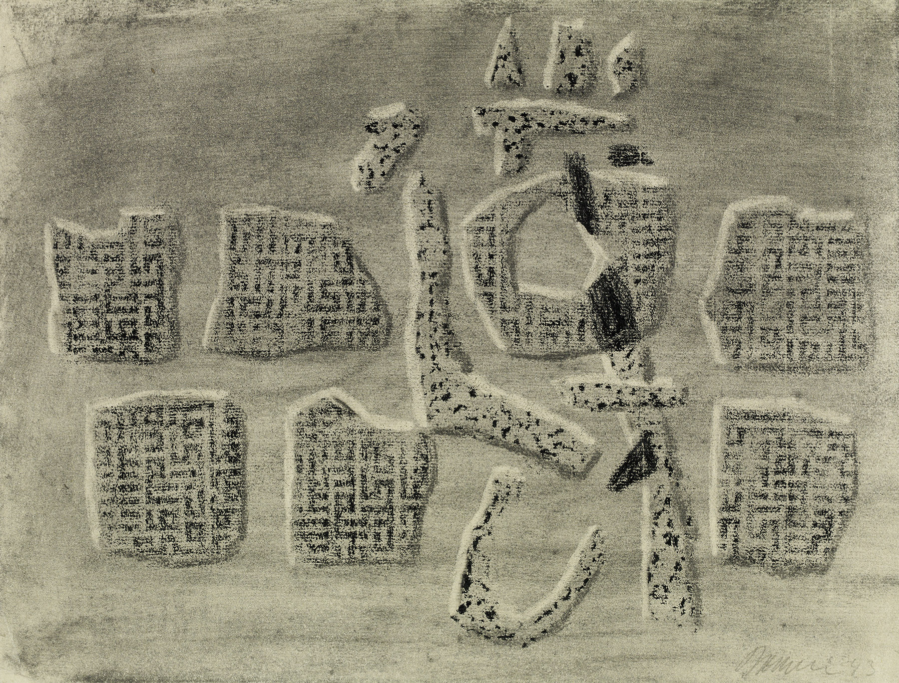 Kohle, gewischt, radiert, Ölkreide in Schwarz, durchgerieben, fixiert, auf lindgrünem Ingres-Bütten mit Wz. l. u.: INGRES