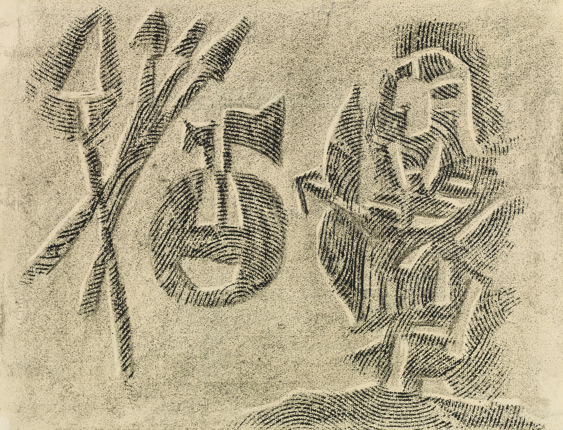 Kohle, gewischt, radiert, Ölkreide in Schwarz, durchgerieben, fixiert, auf hellgelbem Ingres-Bütten