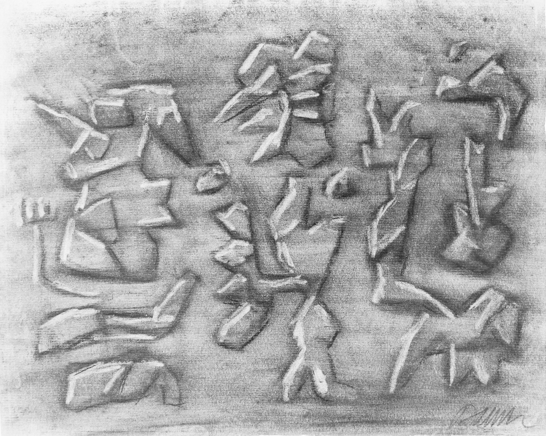 Kohle, gewischt, radiert, fixiert, auf braunem Ingres-Bütten