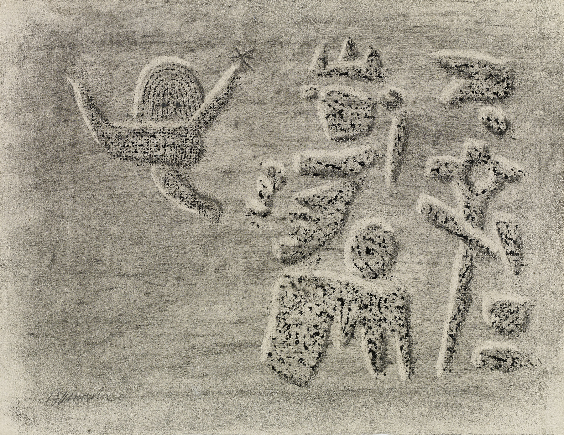 Kohle, gewischt, radiert, Ölkreide in Schwarz, durchgerieben, fixiert, auf chamoisfarbigem Ingres-Bütten mit Wz. l. o.: INGRES