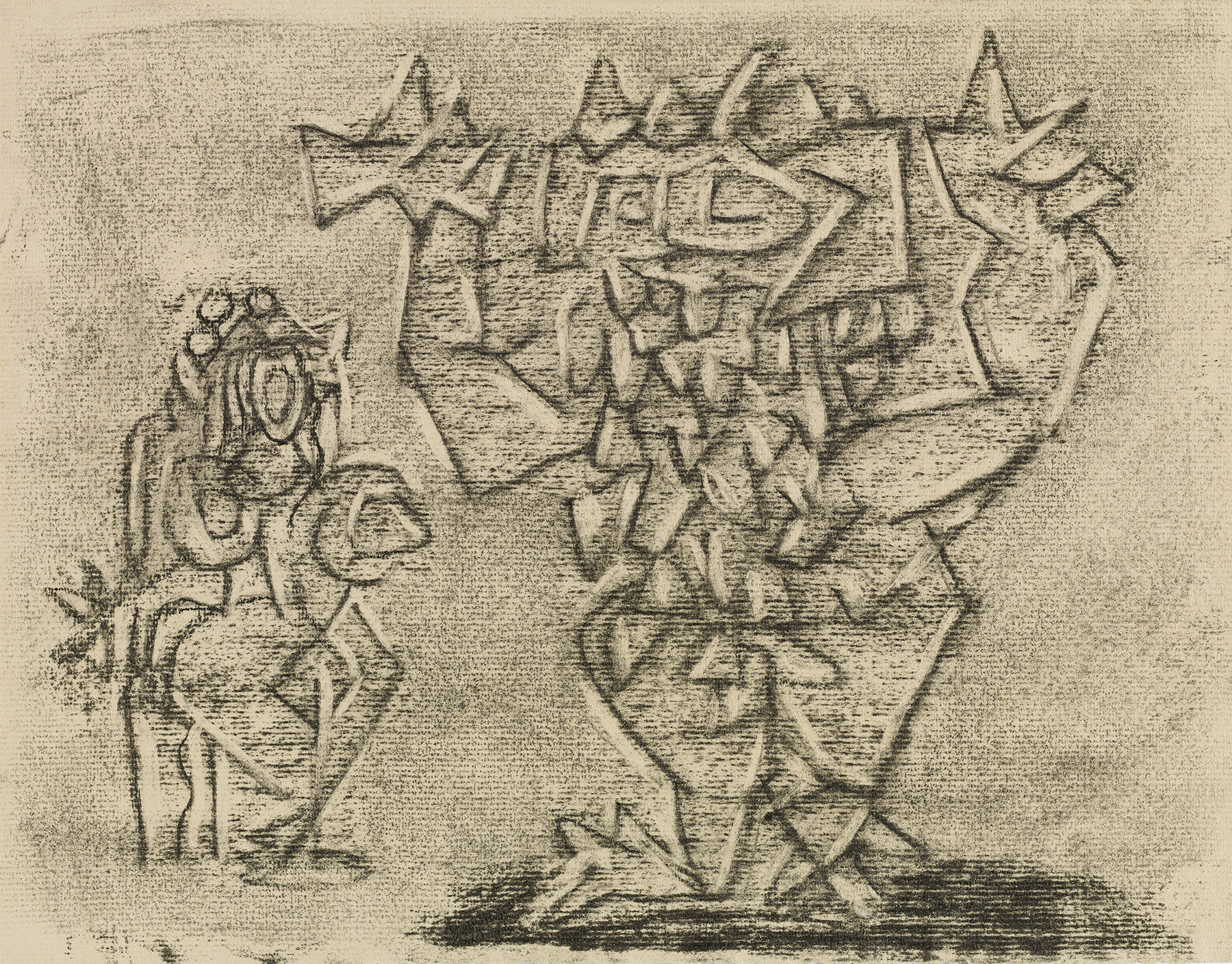 Kohle, gewischt, radiert, fixiert, auf beigefarbigem Ingres-Bütten