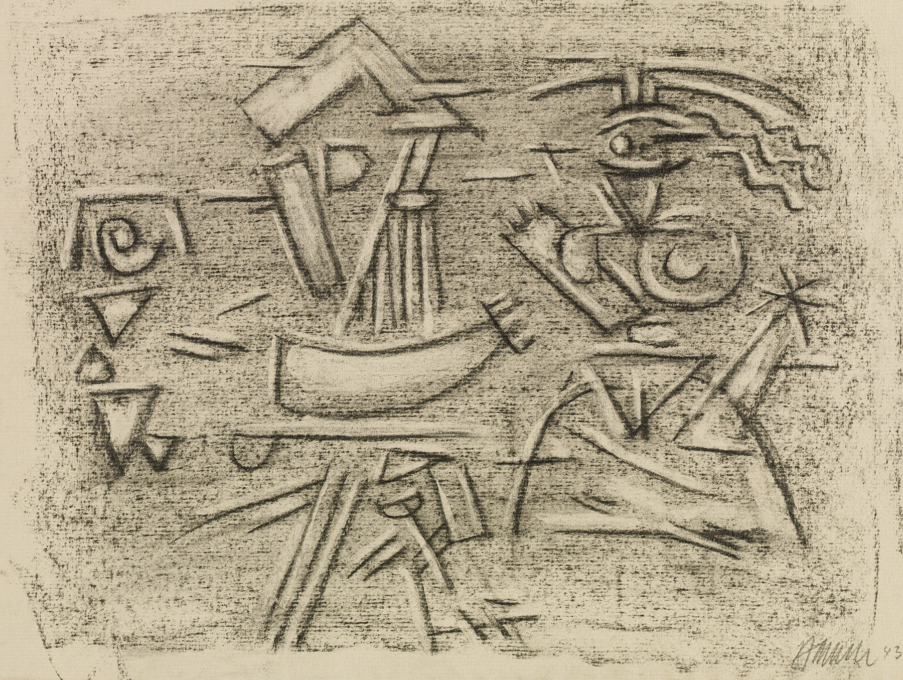 Vgl. die mittlere und die rechte Figur mit den Hauptfiguren des von B. „3.48“ datierten Gemäldes G 977 (seitenverkehrt). Vgl. die Zeichnungen 1673 und 1674 von 1946. (fkb)