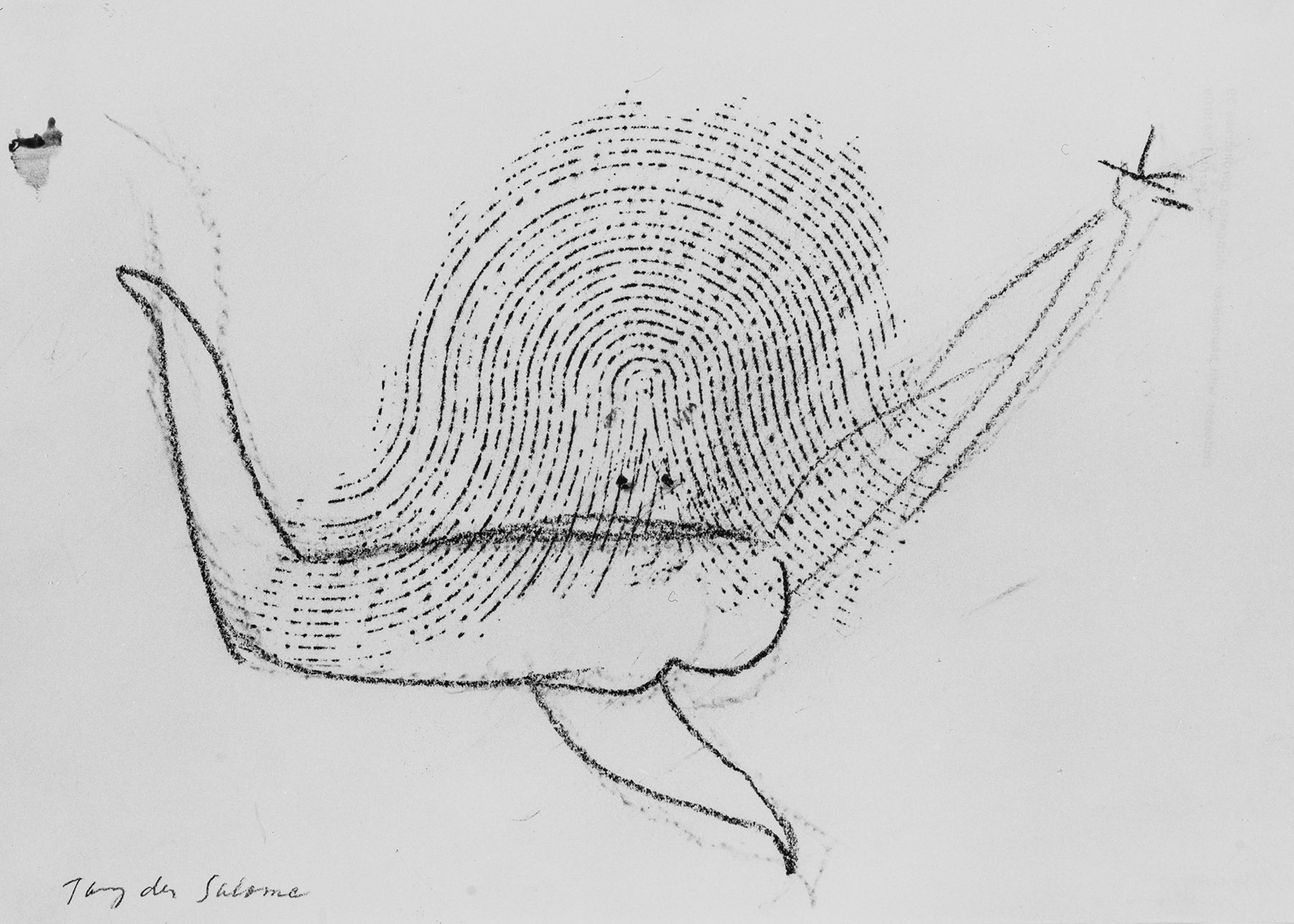 Skizze in Kohle, Ölkreide in Schwarz, z. T. durchgerieben, auf chamoisfarbigem Schreibpapier (verso Briefkopf von B.)