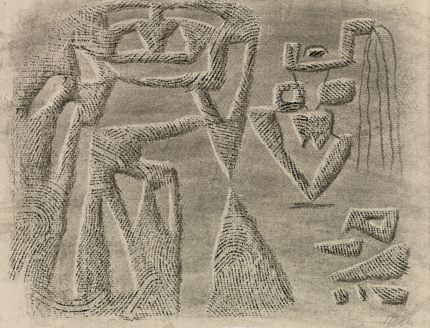 Kohle, gewischt, radiert, Ölkreide in Schwarz, durchgerieben, fixiert, auf beigefarbigem Ingres-Bütten mit Wz l. o.: PMF (ITALIA)