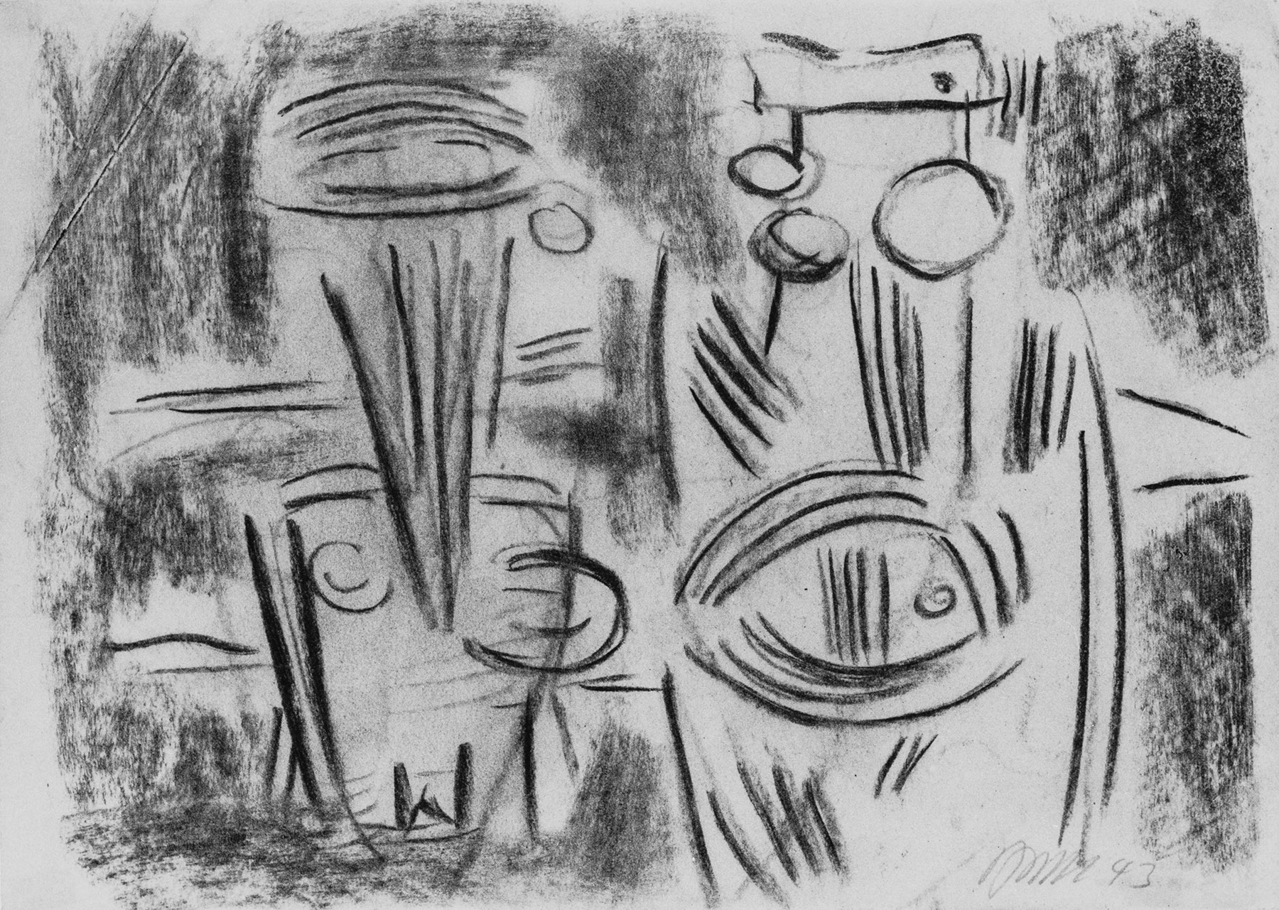 Kohle, z. T. gewischt, fixiert, auf chamoisfarbigem Schreibpapier mit Wz. l. : DYNAMIK . HARTPOST