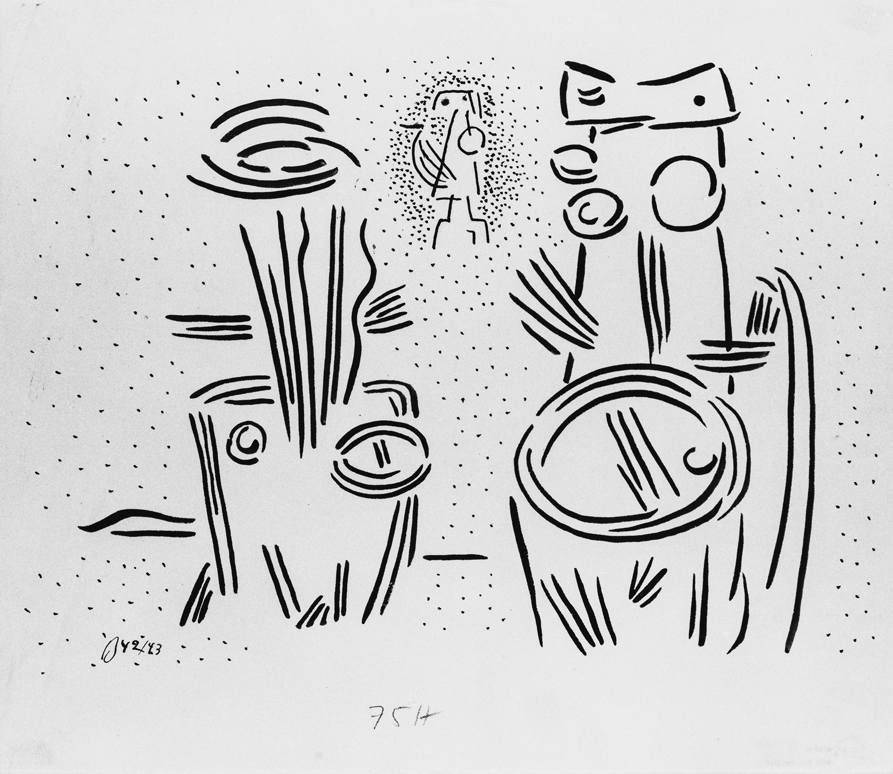 Feder und Pinsel in Tusche in schwarz, auf chamoisfarbigem, durchscheinendem, am Rand l. und u. gerissenem Schreibpapaier mit Wz. r.: DYNAMIK . HARTPOST