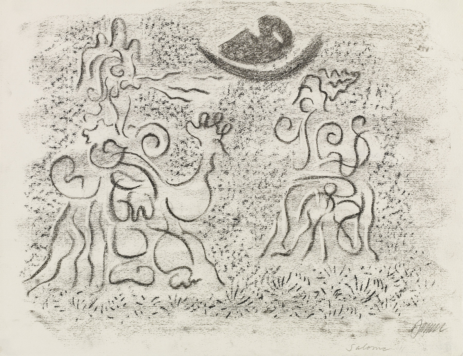 Kohle, gewischt, radiert, Ölkreide in Schwarz, durchgerieben, fixiert, auf chamoisfarbigem Ingres-Bütten mit Wz. r. o.: Hahn im Kreis