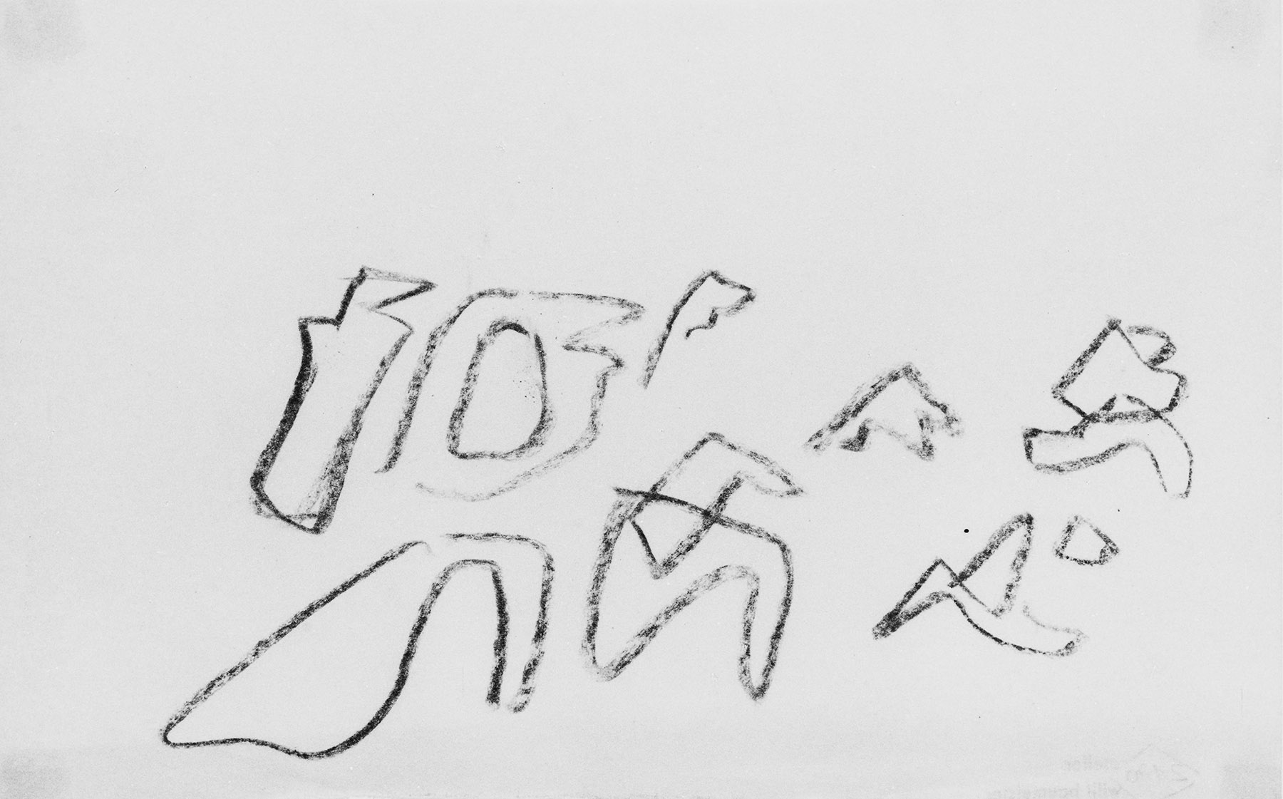 Kohle, fixiert, auf chamoisfarbigem, durchscheinendem, am Rand u. ungleichmäßig gerissenem Schreibpapier