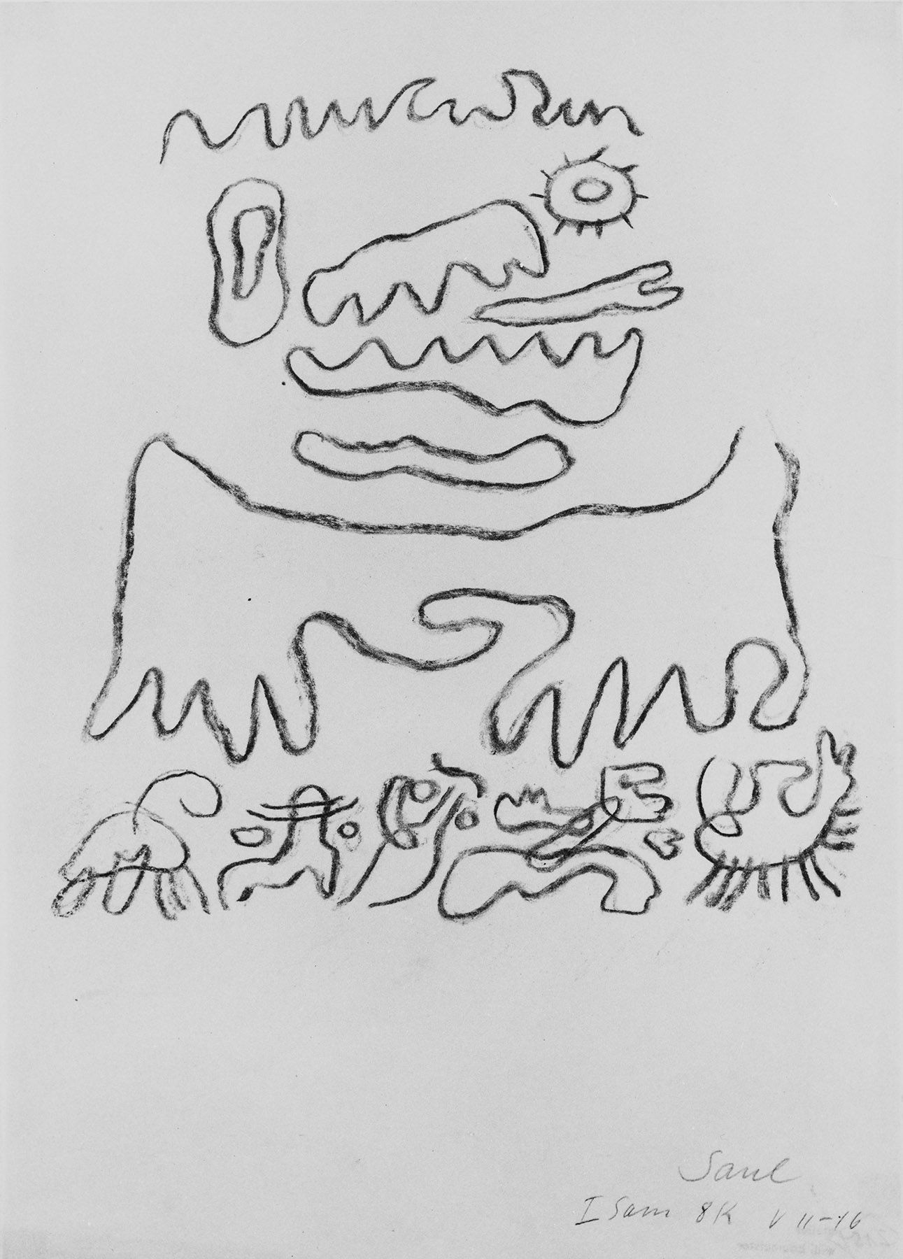 Kohle, fixiert, auf chamoisfarbigem, durchscheinendem Schreibpapier mit Wz. o.: DYNAMIK . HARTPOST