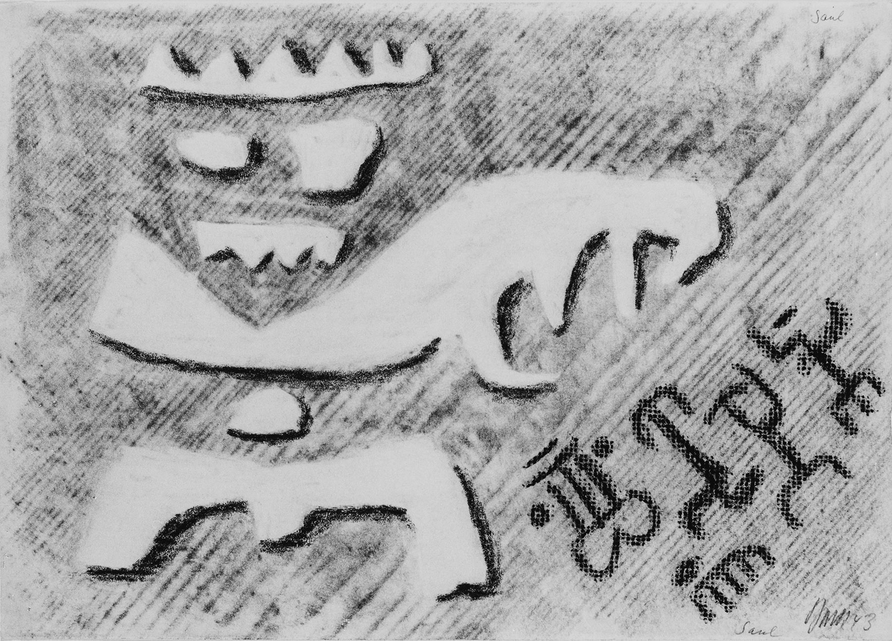 Kohle, durchgerieben, Ölkreide in Schwarz, z. T. durchgerieben, fixiert, auf chamoisfarbigem, durchscheinendem, am Rand r. unregelmäßig gerissenem Schreibpapier mit Wz. l. : DYNAMIK . HARTPOST