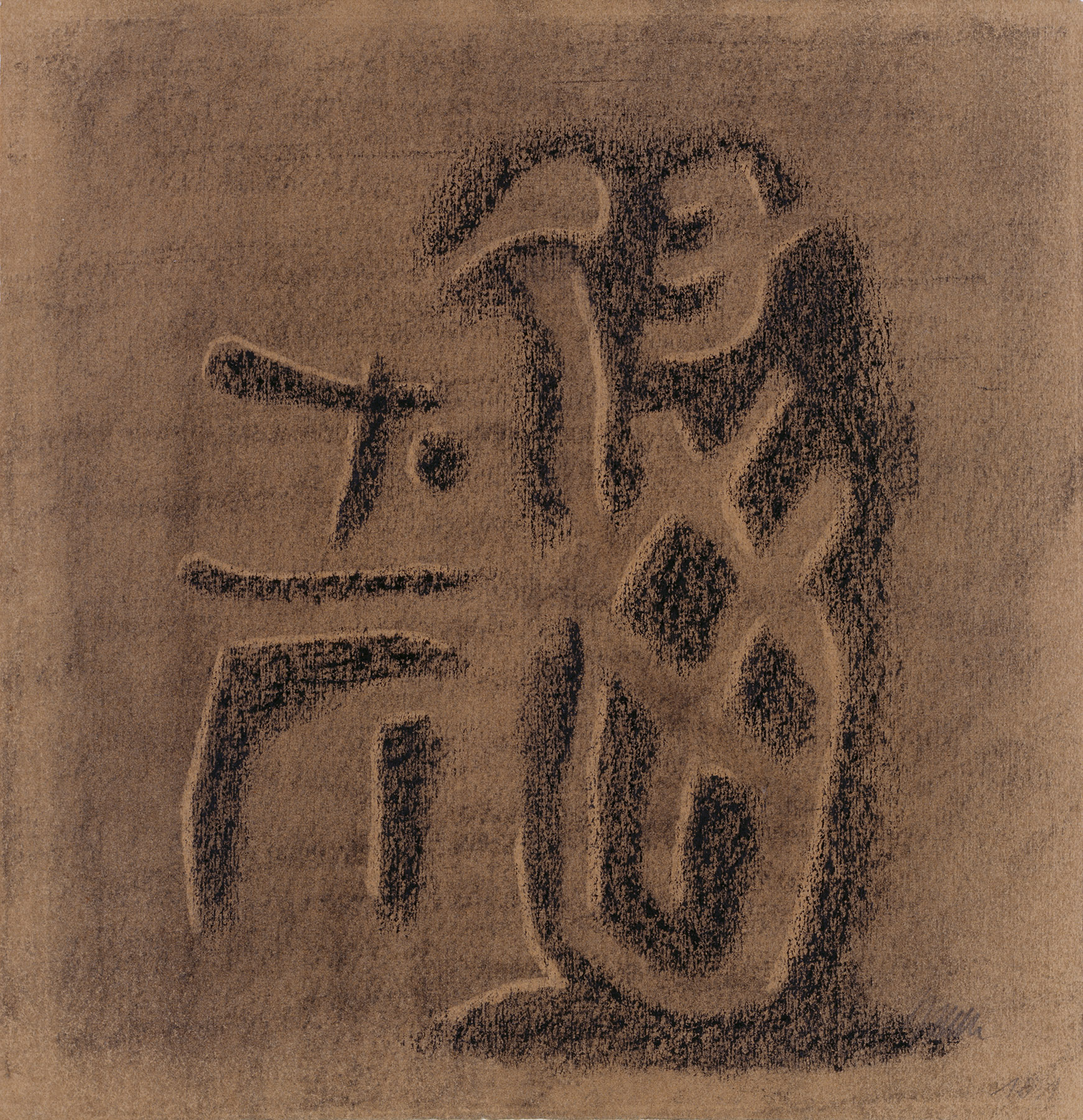 Kohle, gewischt, radiert, Ölkreide in Schwarz, fixiert, auf ziegelbraunem, am Rand o. leicht unregelmäßigem Ingres-Bütten
