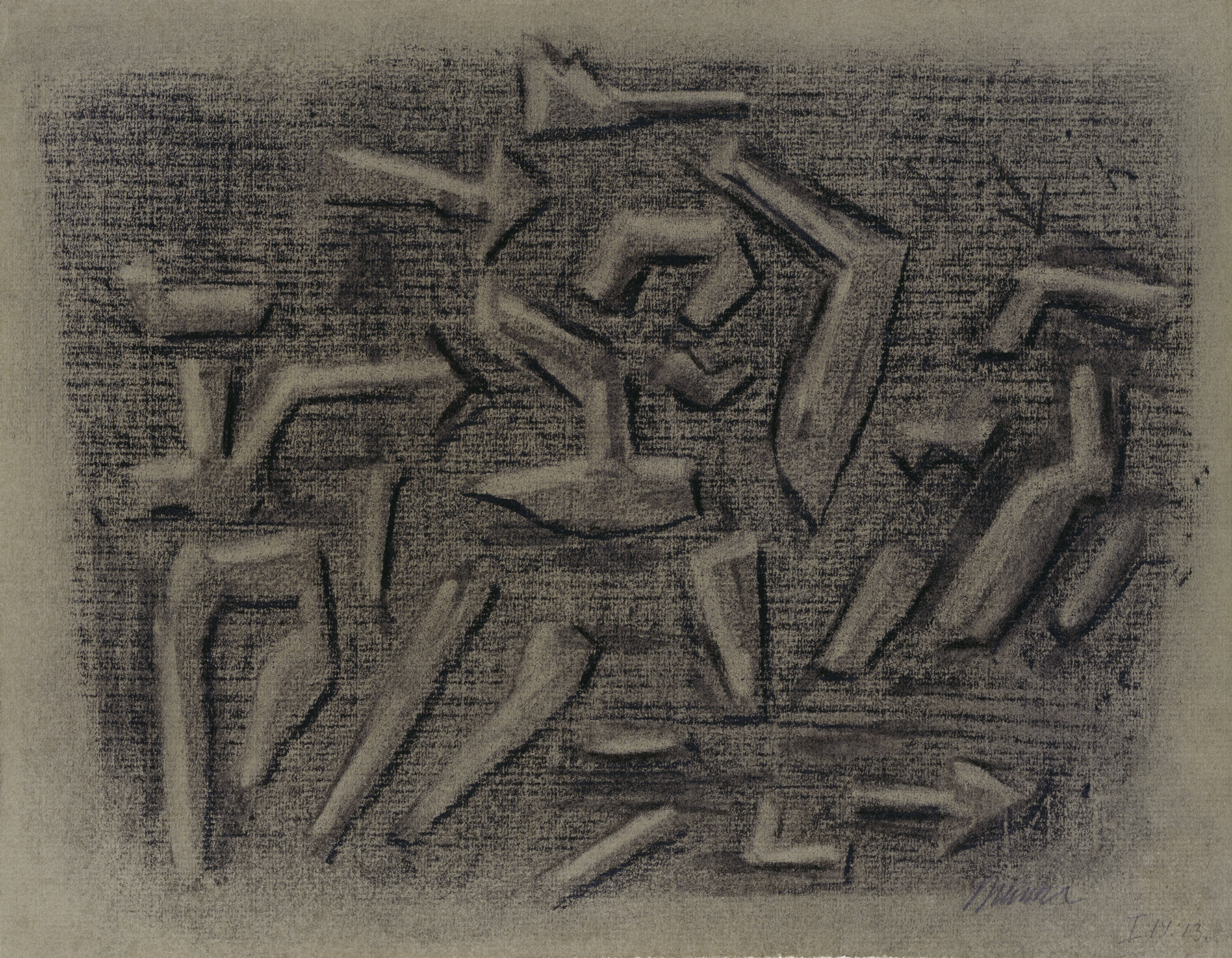 Kohle, gewischt, radiert, Ölkreide in Schwarz, z. T. durchgerieben, fixiert, auf olivfarbigem, am Rand o. leicht unregelmäßigem Ingres-Bütten mit Wz. r. u.: PMF (ITALIA)