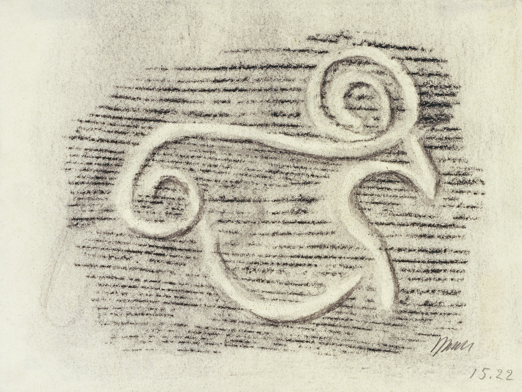 Kohle, gewischt, radiert, Ölkreide in Schwarz, durchgerieben, fixiert, über Skizze in Kohle (mit starken Abweichungen), auf chamoisfarbigem, dünnem Zeichenpapier