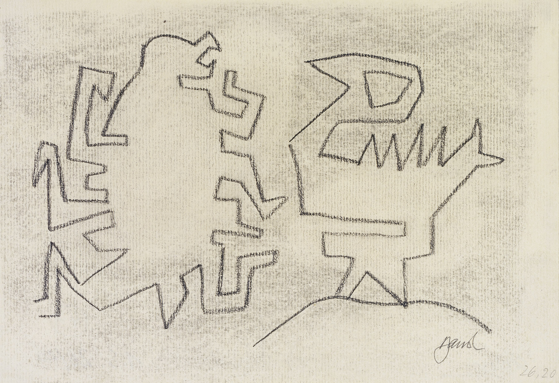 Kohle, gewischt, Ölkreide in Schwarz, fixiert, auf chamoisfarbigem, am Rand l. unregelmäßig von l. o. nach r. u. gerissenem Maschinen-Bütten