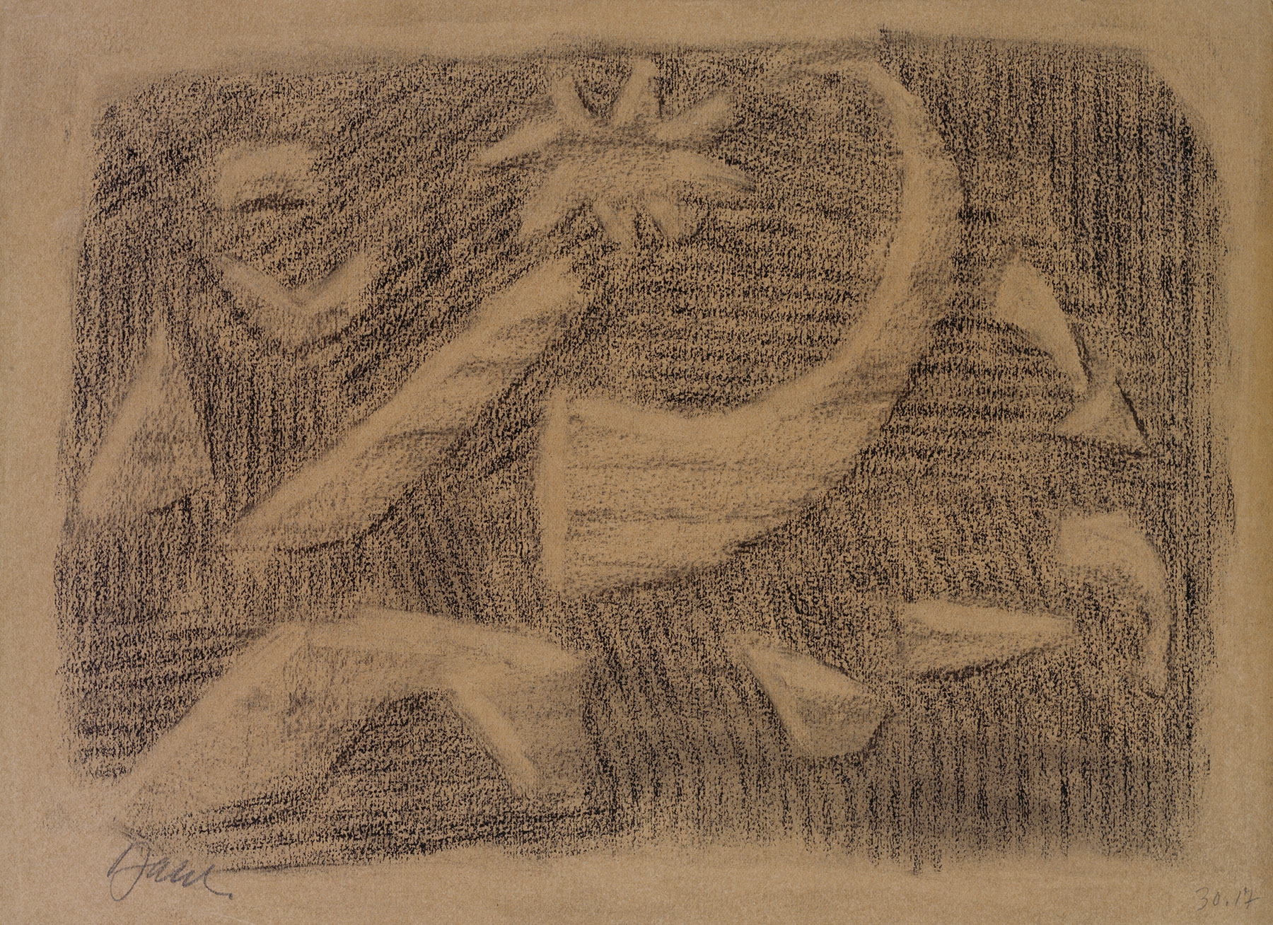 Kohle, gewischt, radiert, Ölkreide in Schwarz, fixiert, auf ziegelbraunem Ingres-Bütten