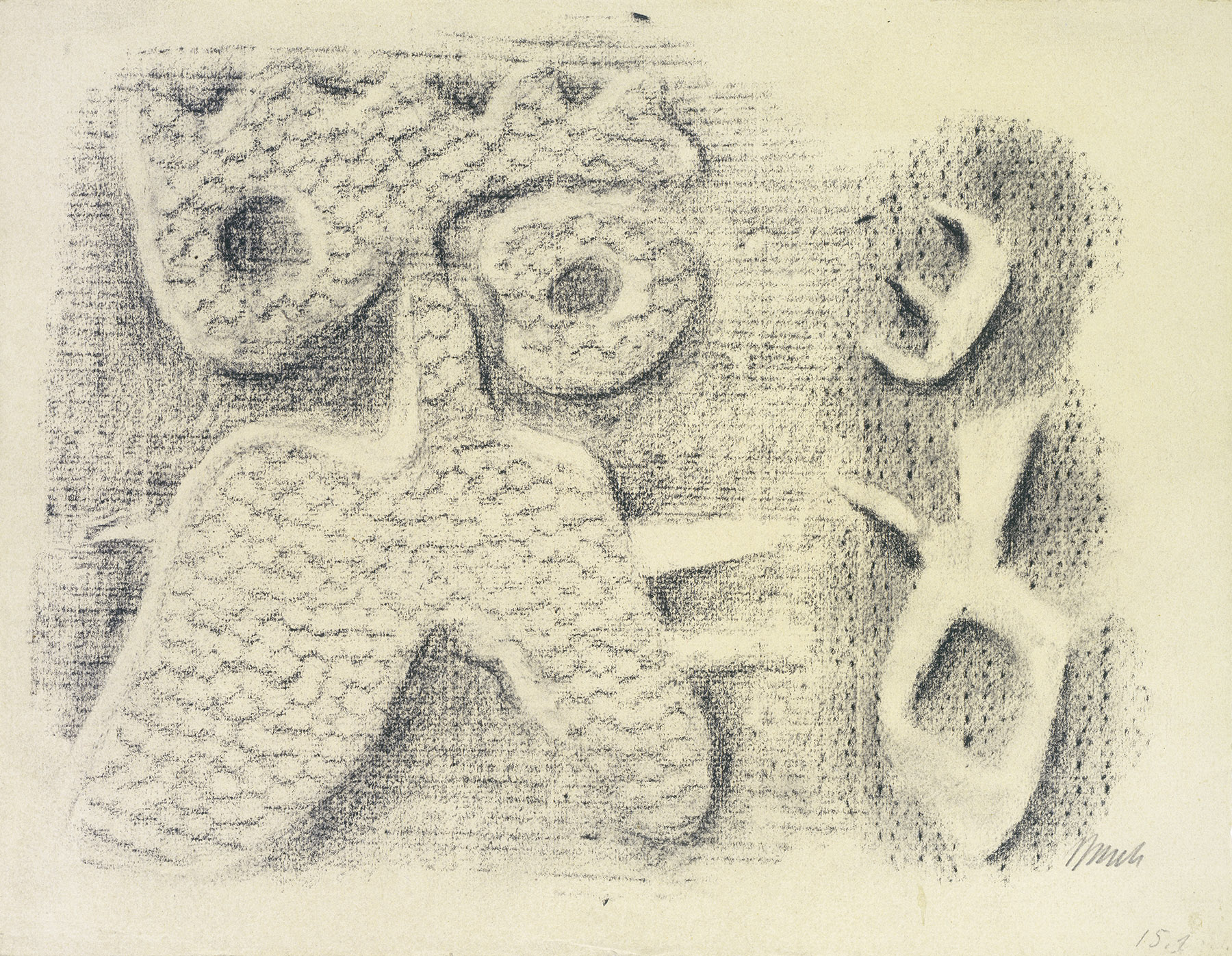 Kohle, z. T. gewischt, Ölkreide in Schwarz, durchgerieben, fixiert, auf chamoisfarbigem Ingres-Bütten mit Wz. r. o.: Hahn im Kreis