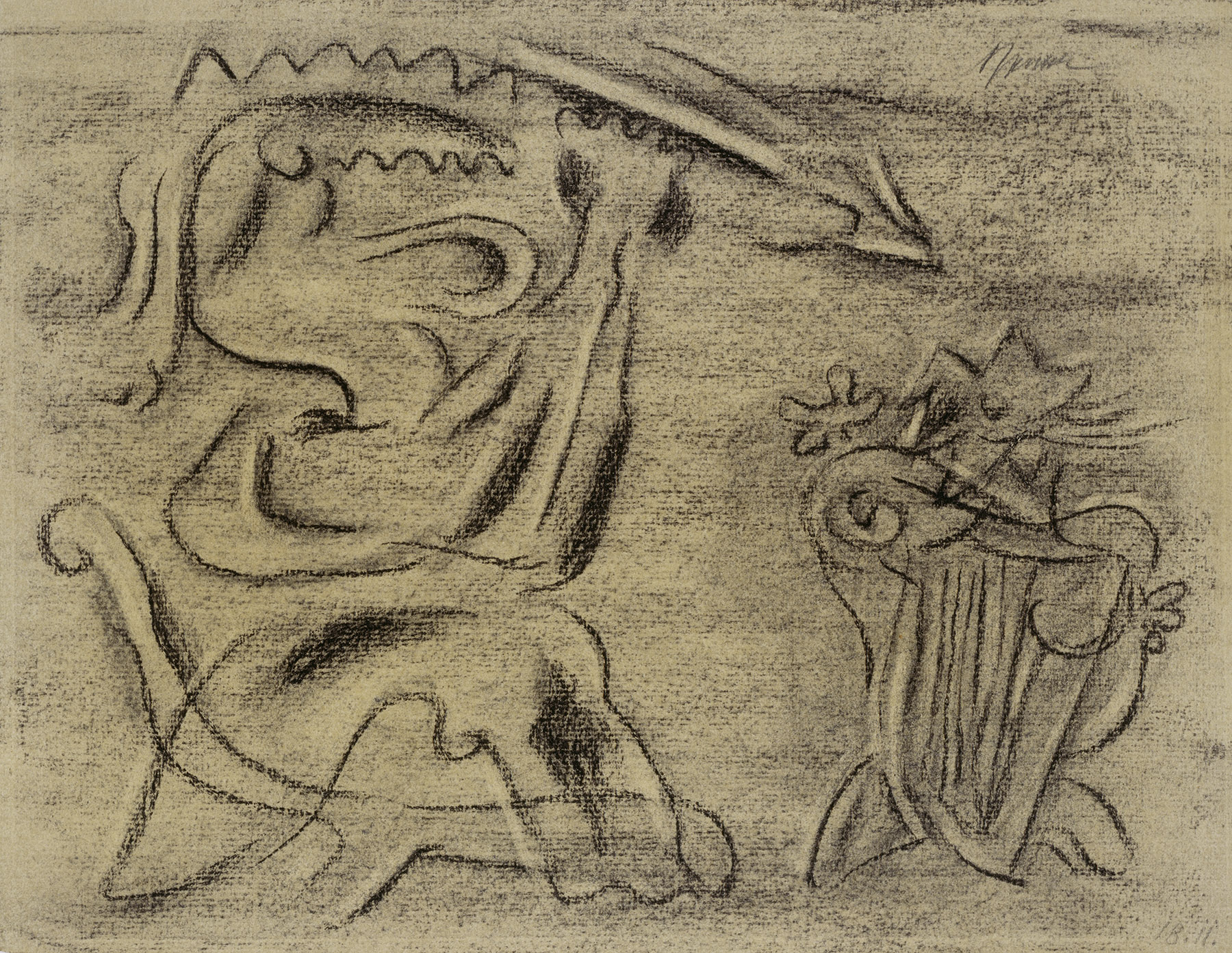 Kohle, gewischt, radiert, fixiert, auf beigefarbigem Ingres-Bütten