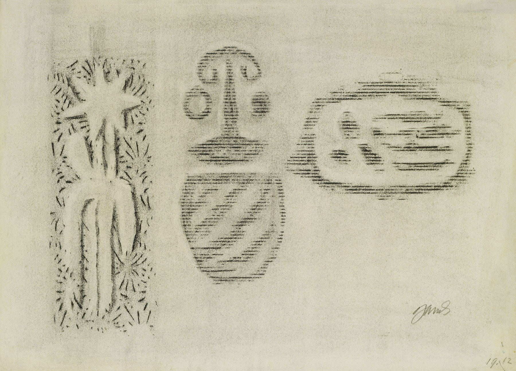 Kohle, gewischt, radiert, Ölkreide in Schwarz, durchgerieben, fixiert, auf chamoisfarbigem, dünnem, am Rand o. perforiertem Zeichenpapier.