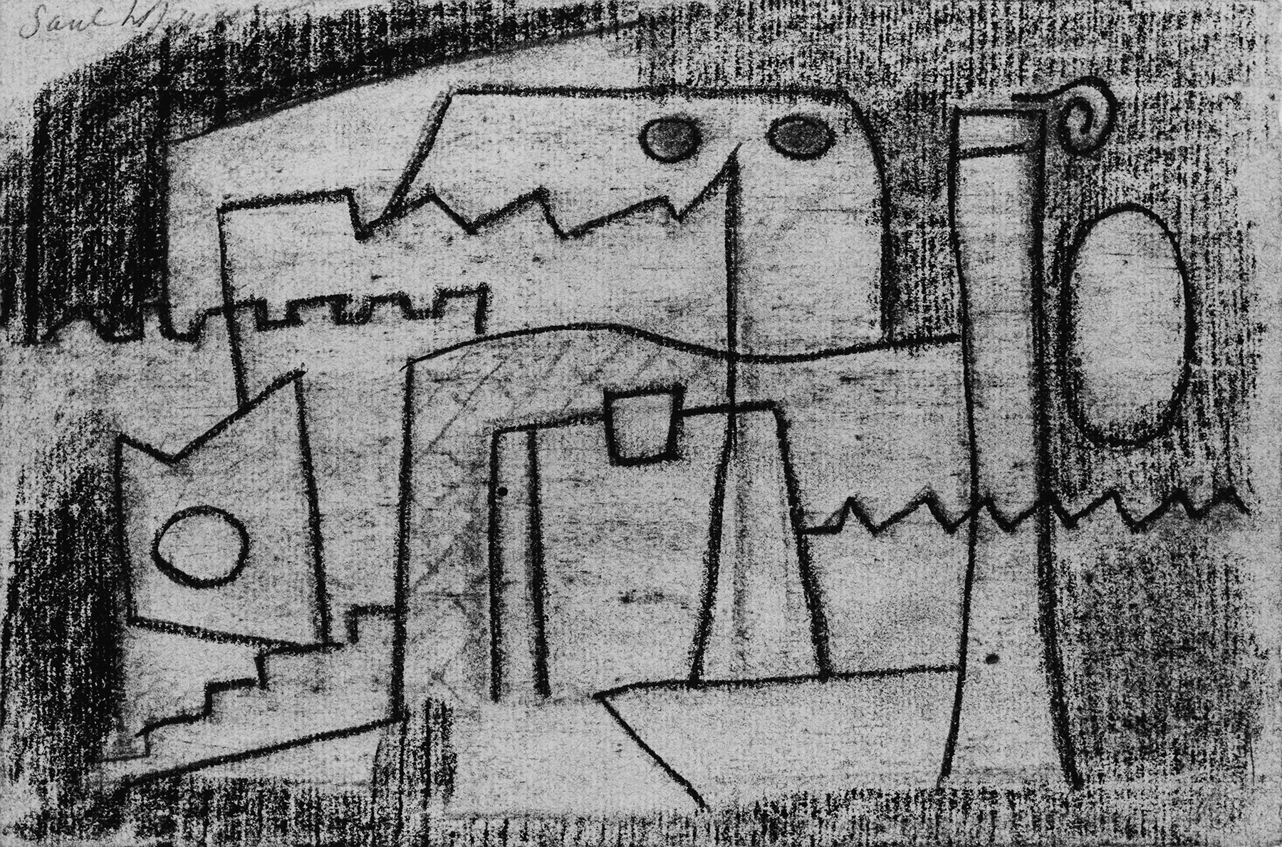 Kohle, gewischt, Ölkreide in Schwarz, z. T. durchgerieben, Bleistift, Konturen mit Druck übergangen, fixiert, auf lichtblauem Ingres-Bütten, Rückseite geschwärzt