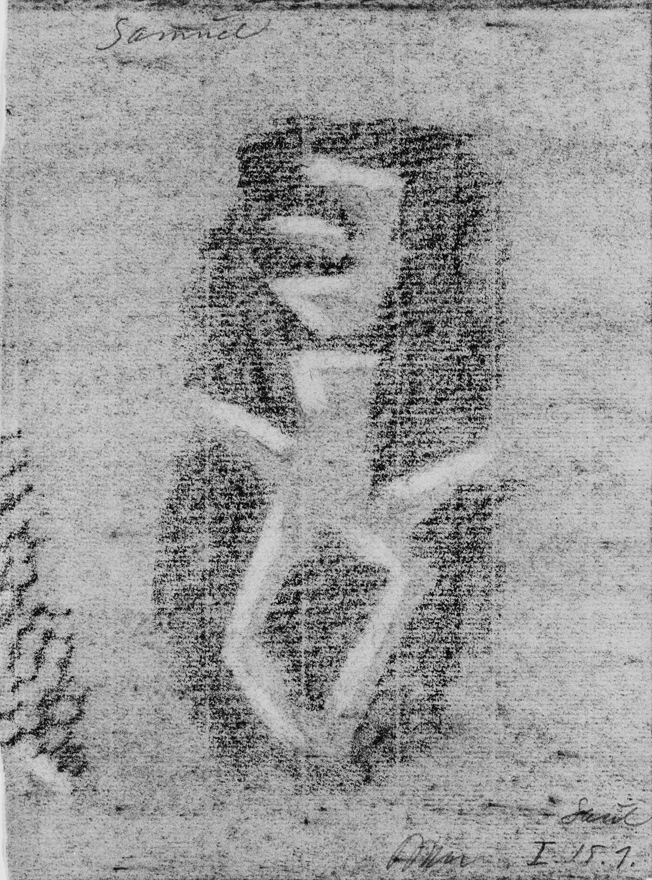 Kohle, gewischt, radiert, Ölkreide in Schwarz, durchgerieben, fixiert, auf hellbeigefarbigem, am Rand l. unregelmäßig gerissenem Ingres-Bütten