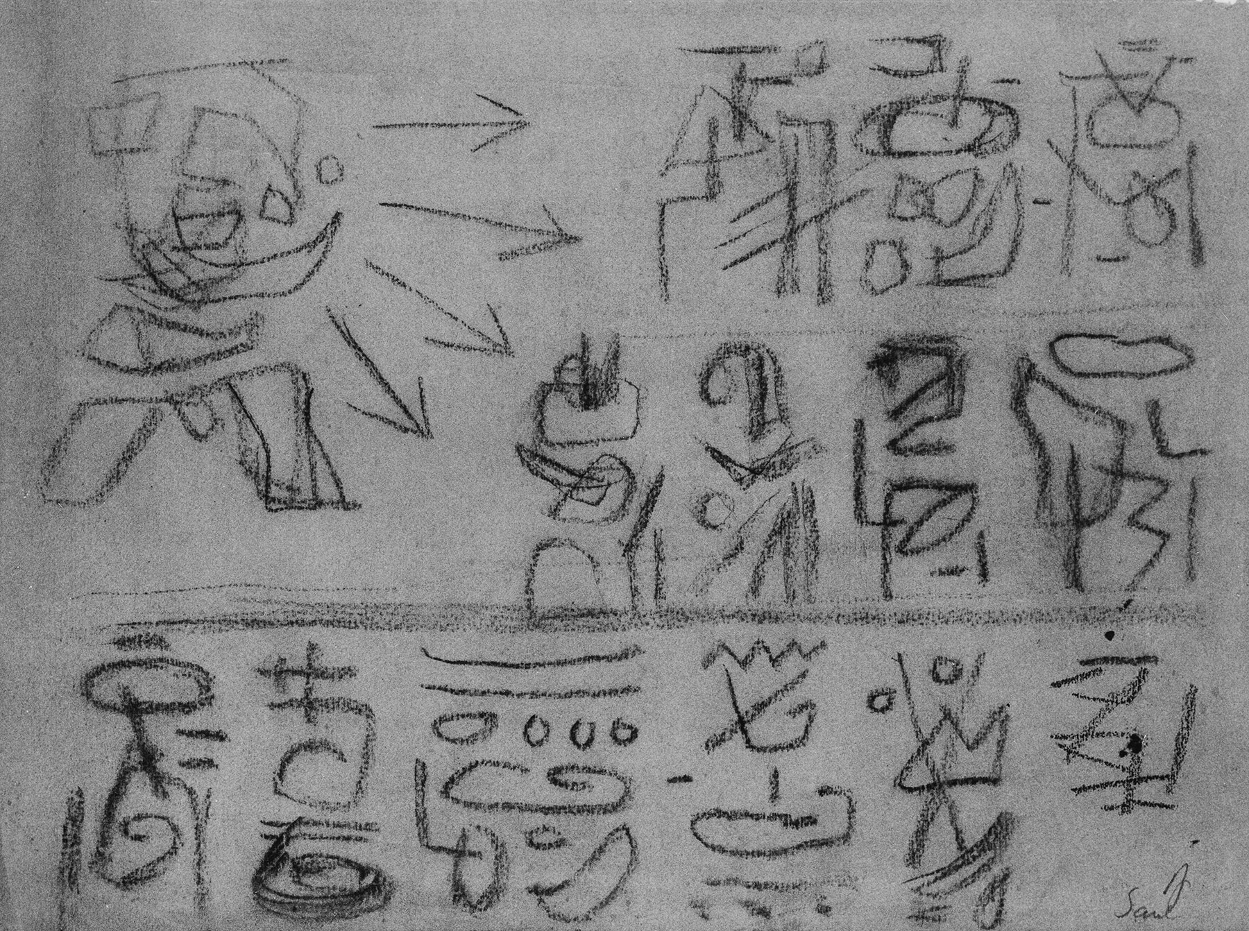 Kohle, Ölkreide in Schwarz, fixiert, auf rotbraunem, am Rand o. unregelmäßig gerissenem Ingres-Bütten mit Wz. l. u.: P. M. FABRIANO