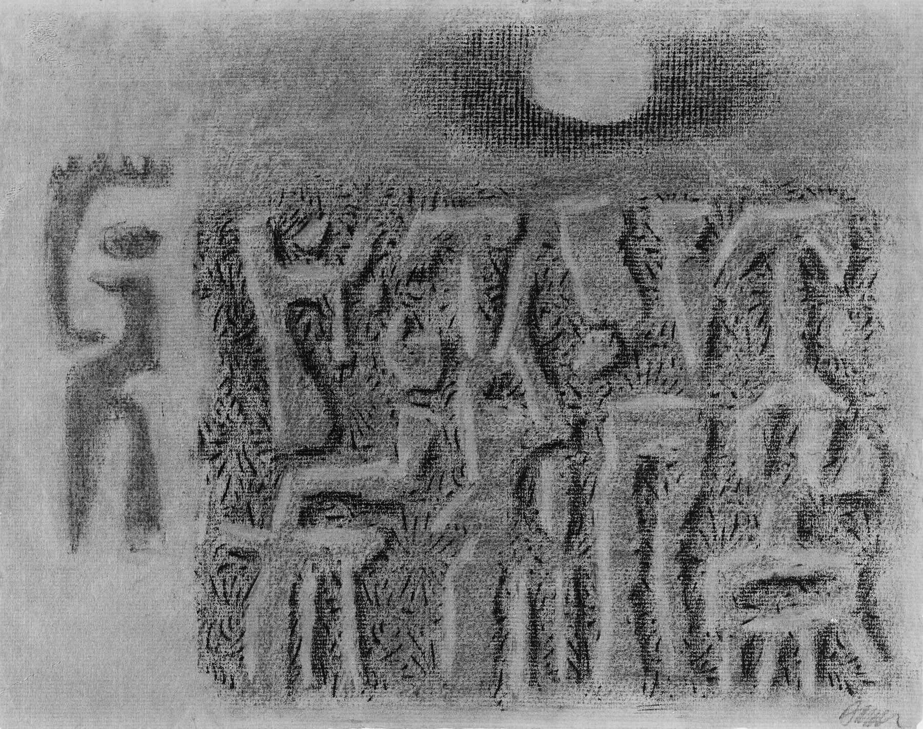 Kohle, gewischt, radiert, Ölkreide in Schwarz, durchgerieben, fixiert, auf braunem Ingres-Bütten