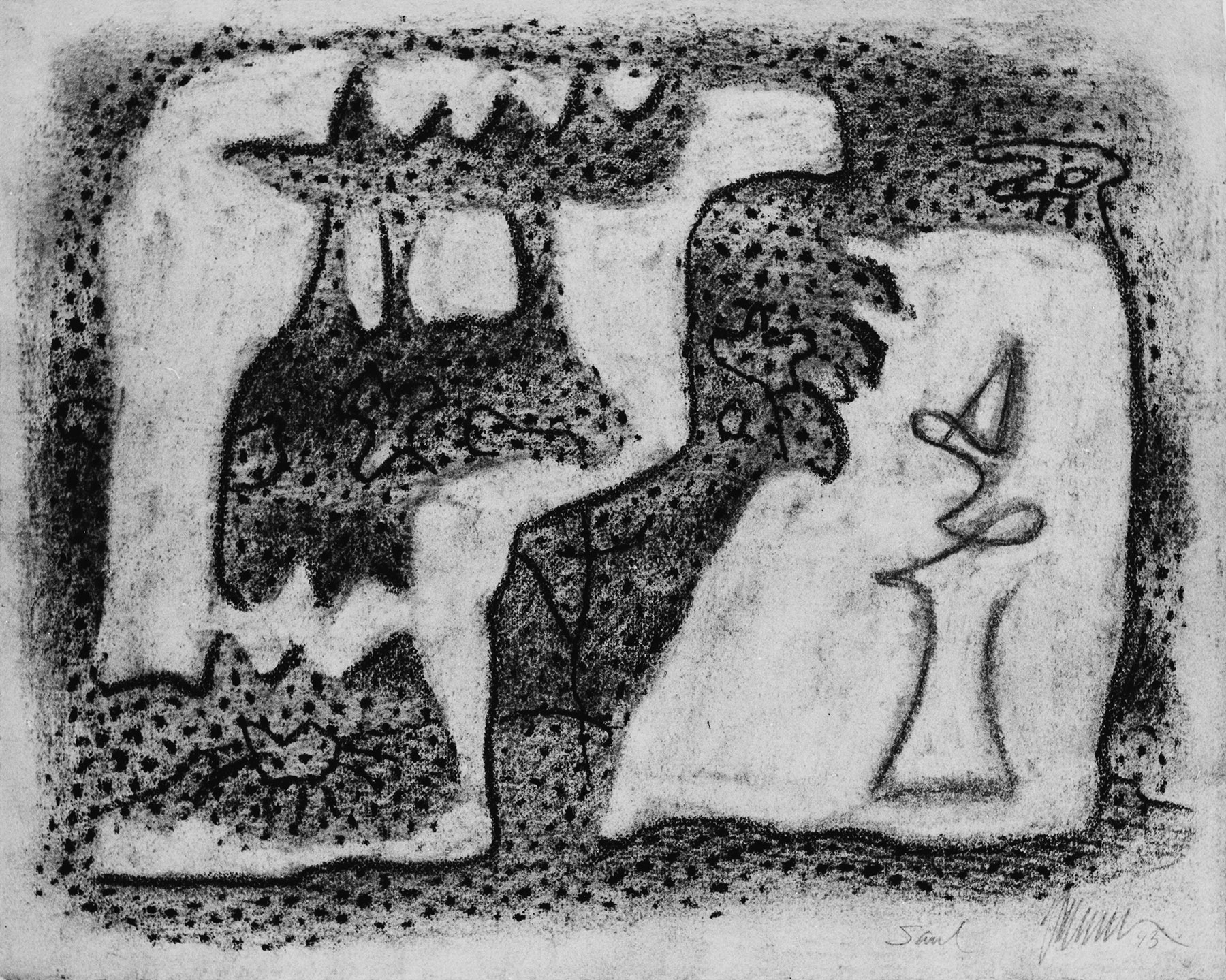 Kohle, gewischt, radiert, Ölkreide in Schwarz, Blau, Braun, Rot, fixiert, auf chamoisfarbigem Aquarellpapier