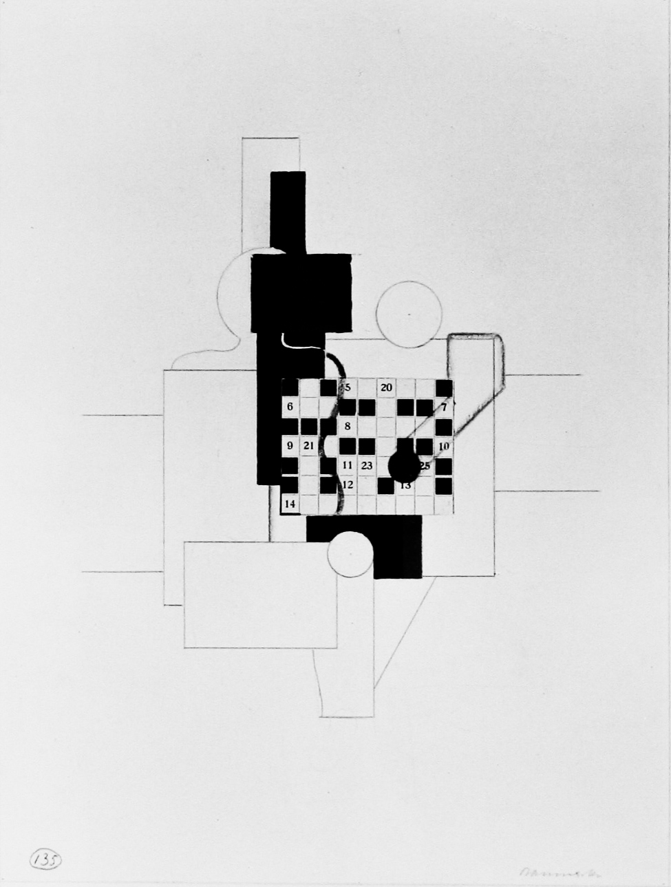 Feder in Tusche, Deckfarben in Grau, Braun, Farbstifte in Rot, Blau und Bleistift, unter Verwendung von Zirkel und Lineal, über sehr dünner Skizze in Bleistift (mit z. T. starken Abweichungen) und Collage (Teil eines gedruckten leeren Kreuzworträtsels, re