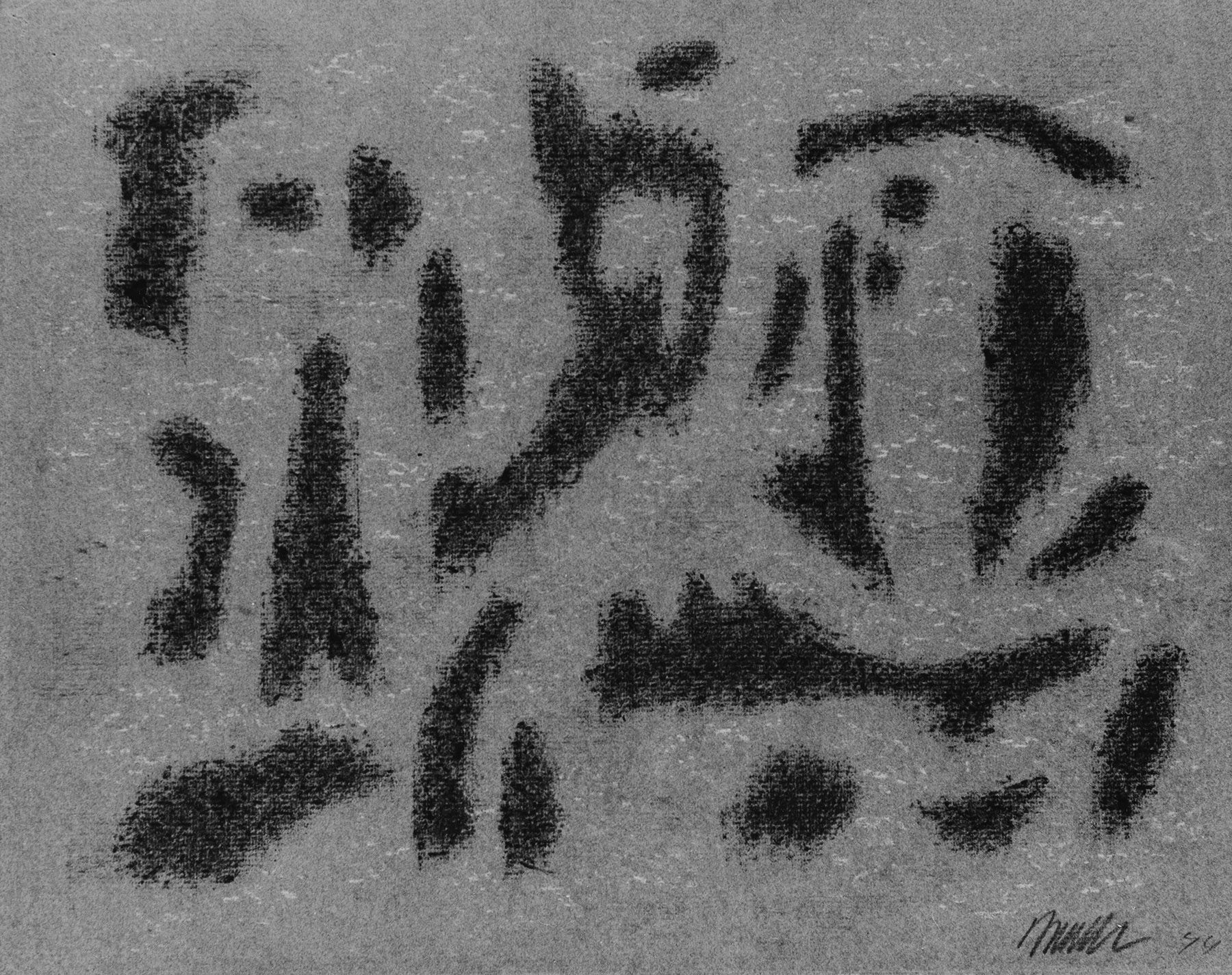 Kohle, Ölkreide in Schwarz, Dunkelviolett, Pastell in Gelb, Orange, Ocker, Weiß, fixiert, auf grauviolettem Ingres-Bütten mit Wz. l. o.: INGRES