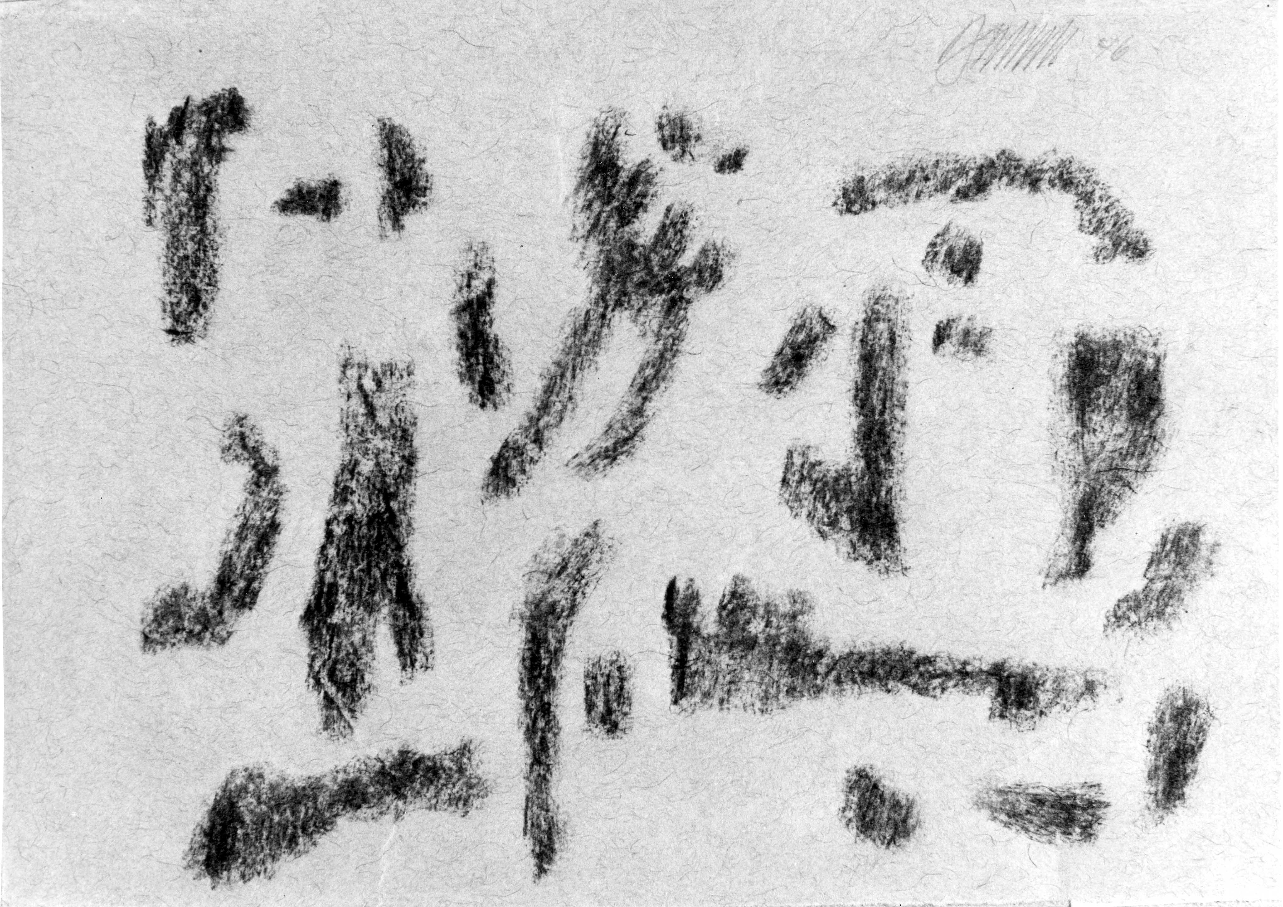Kohle, fixiert, auf ziegelrotem Maschinen-Bütten (Vorsatzpapier)
