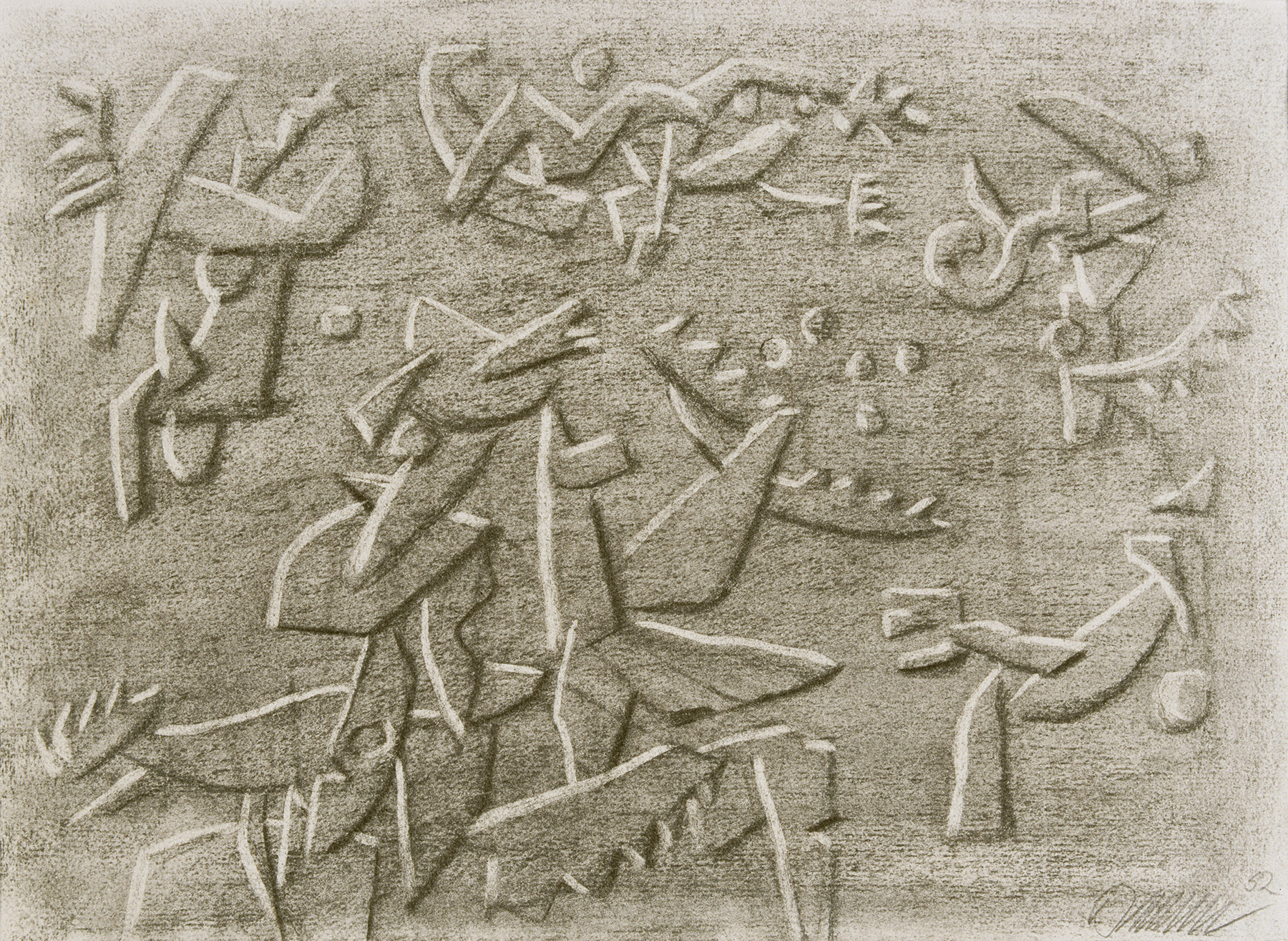 Kohle, gewischt, radiert, fixiert, auf chamoisfarbigem, am Rand o. perforiertem Ingres-Bütten
