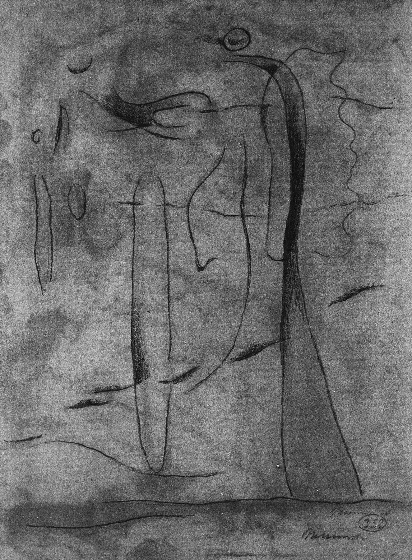 Kohle, gewischt, Bleistift, Ölkreide in Schwarz, fixiert, auf hellbraunem, am Rand l. perforiertem Maschinenbütten
